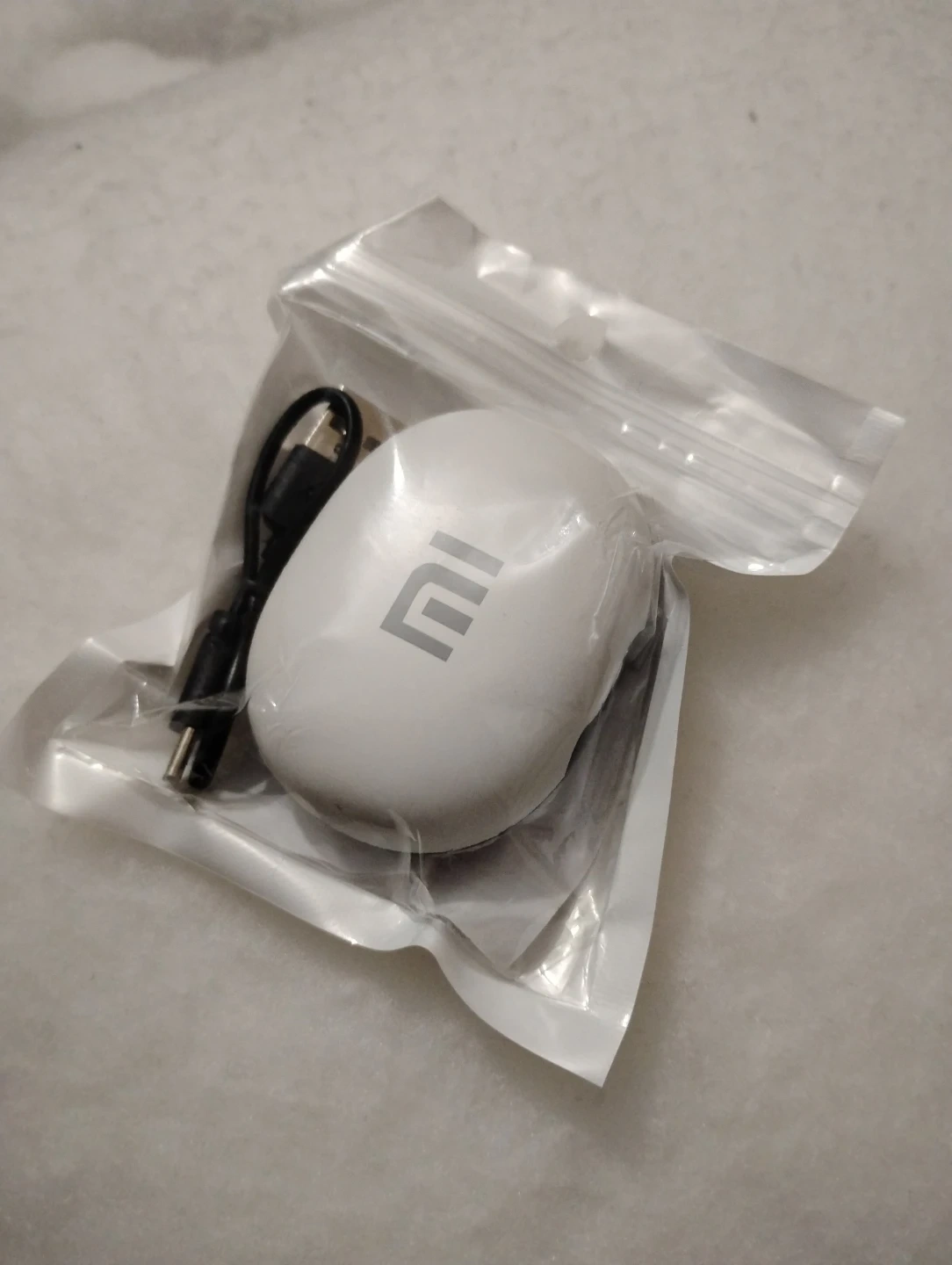 Xiaomi XM-D101 wireless Bluetooth earphones in white. These noise reduction bone conduction earphones include a charging cable. They are made in China.