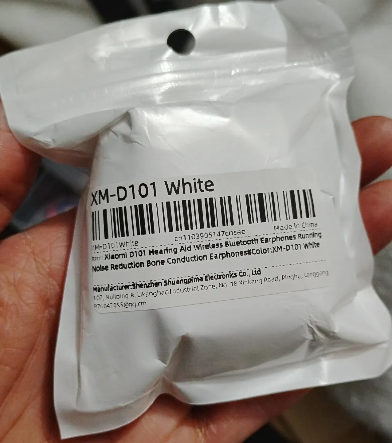 Xiaomi XM-D101 wireless Bluetooth earphones in white. These noise reduction bone conduction earphones include a charging cable. They are made in China.