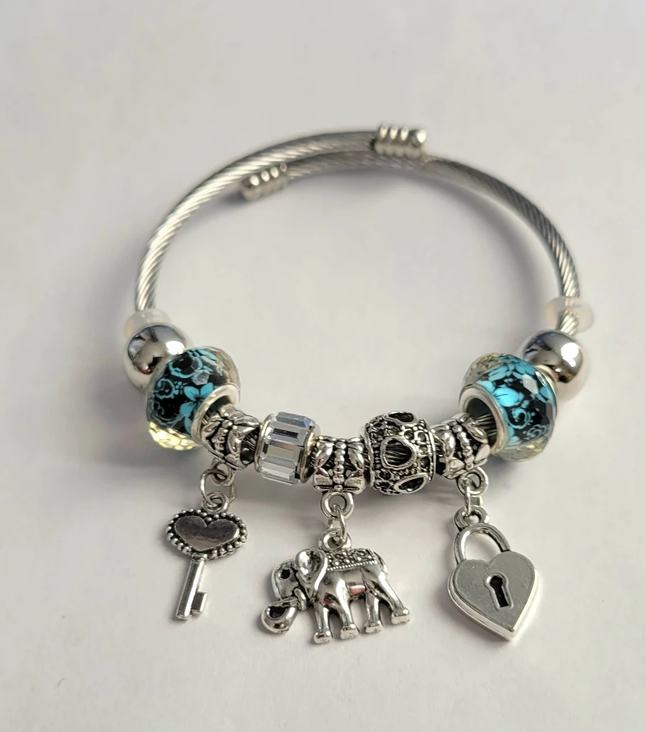 Selling a lovely charm bracelet! It features a variety of silver-tone charms, including a key, an elephant, and a heart-shaped lock. The bracelet also has decorative beads in silver and blue floral patterns. It's a unique and eye-catching piece!