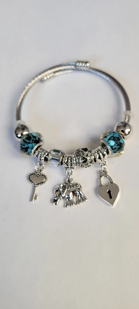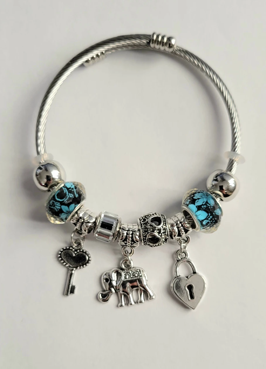 Selling a lovely charm bracelet! It features a variety of silver-tone charms, including a key, an elephant, and a heart-shaped lock. The bracelet also has decorative beads in silver and blue floral patterns. It's a unique and eye-catching piece!
