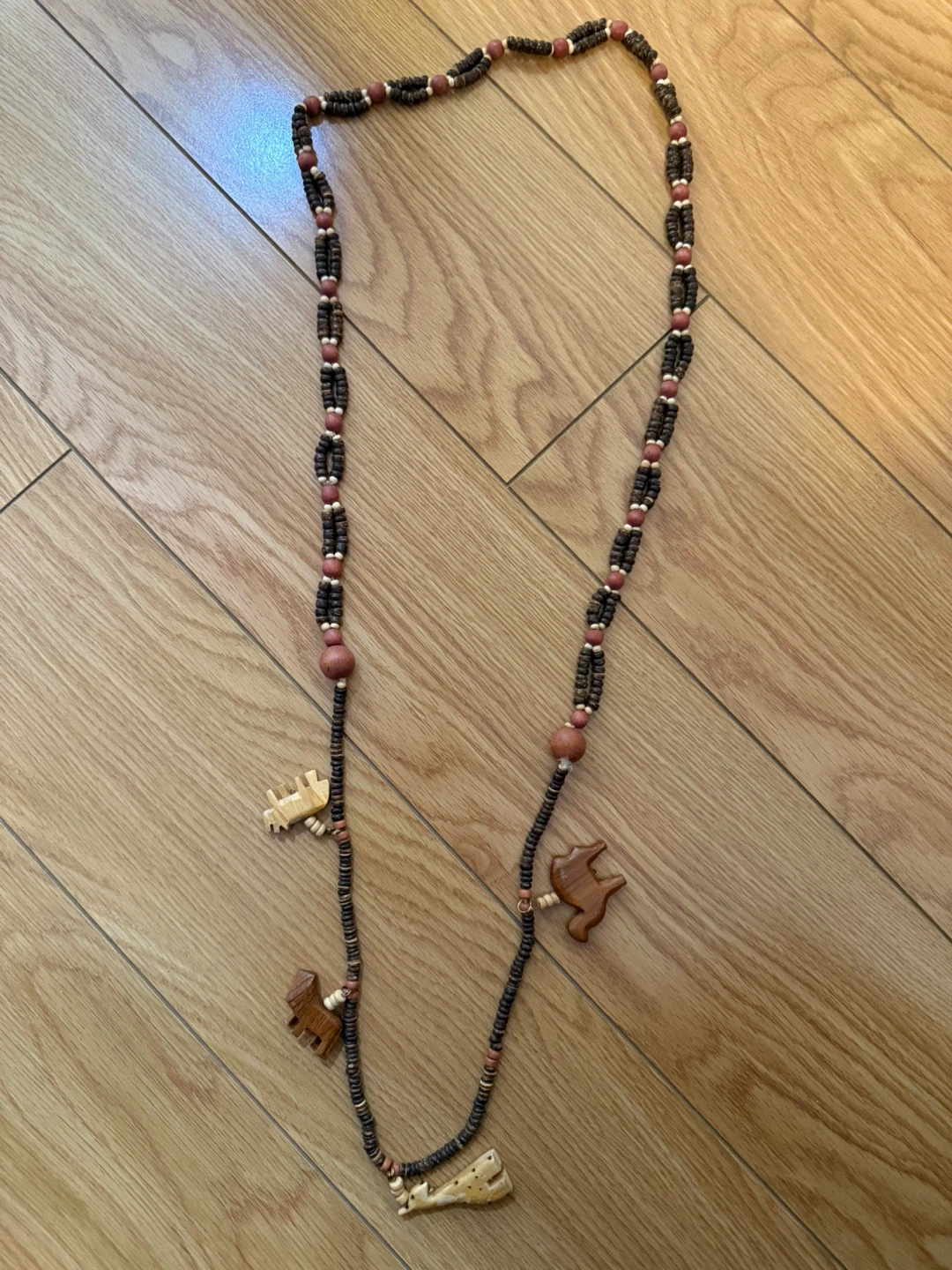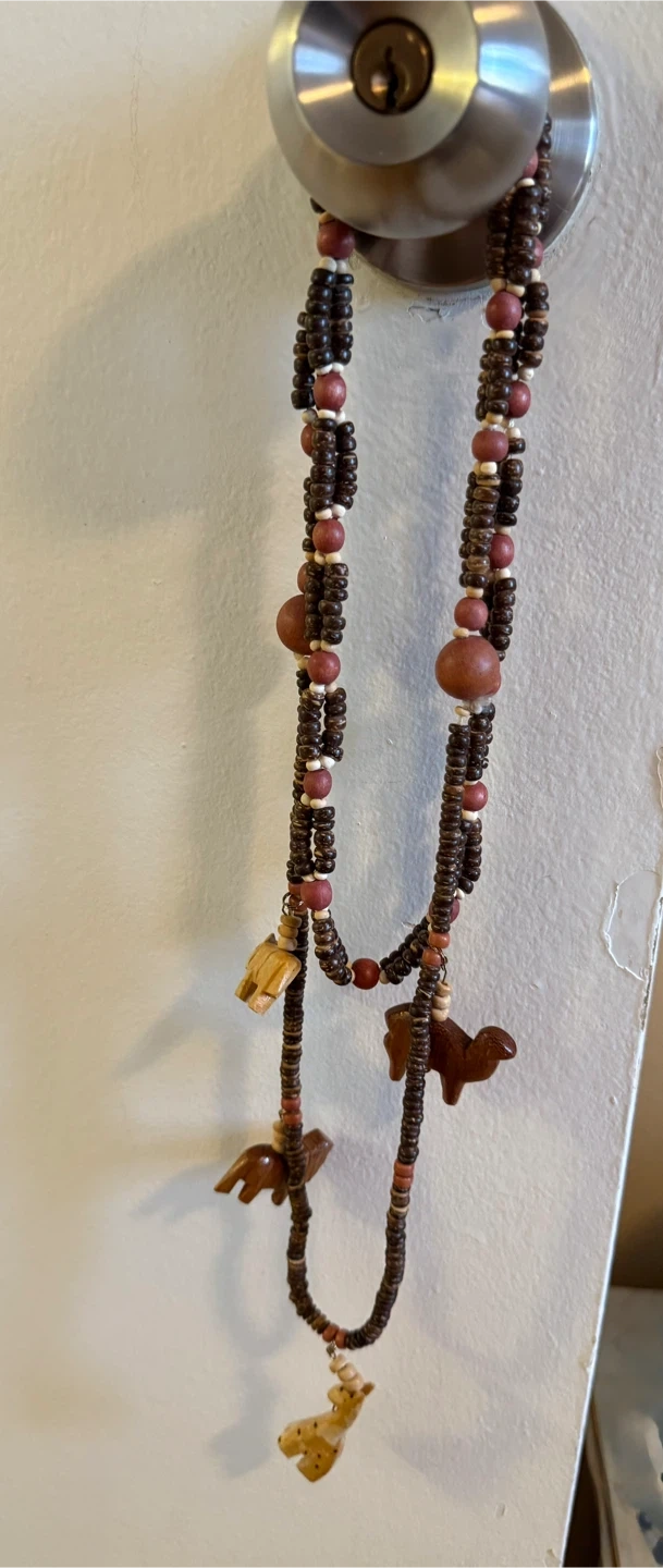 Unique beaded wooden necklace featuring small carved animal charms. It's made with various brown and reddish beads, strung together to create a bohemian style. This necklace adds a fun touch to any outfit! In perfect condition.
