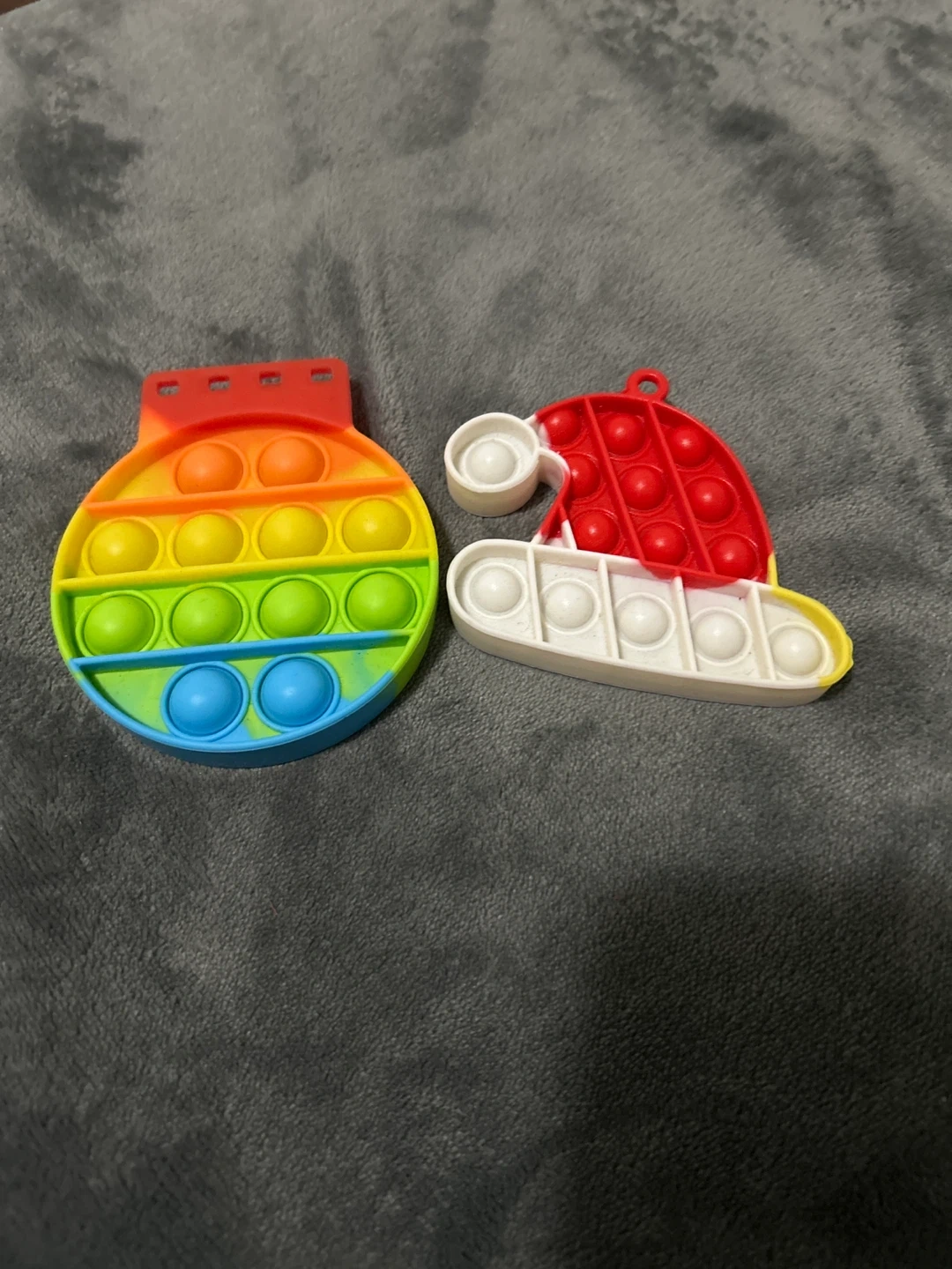 Two festive pop it fidget toys. One is shaped like a Christmas ornament, and the other is a Santa hat. These are fun for popping and fidgeting!