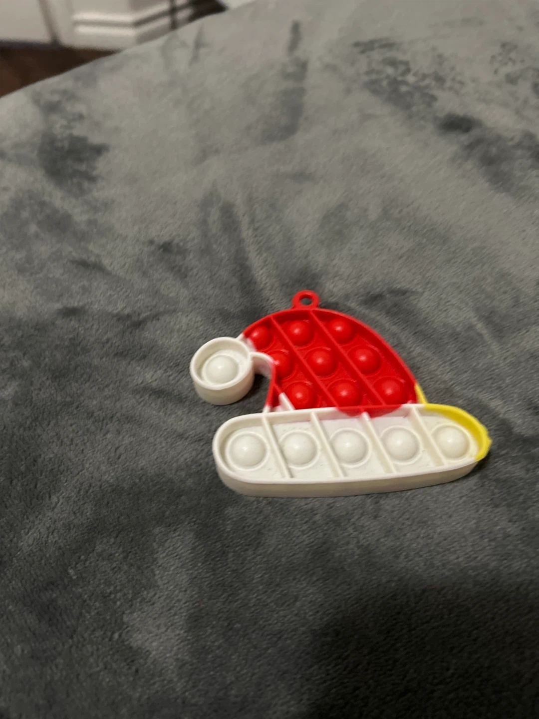 Two festive pop it fidget toys. One is shaped like a Christmas ornament, and the other is a Santa hat. These are fun for popping and fidgeting!