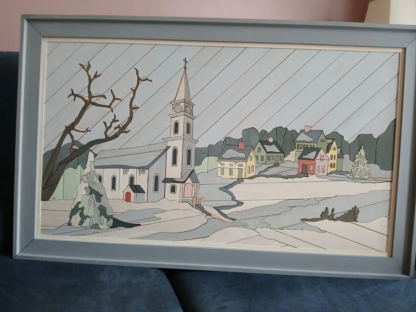 Winter Church Scene. Beautifully crafted Marquetry panel. 28x16 High quality natural wood grains: features premium (Birdseye Maple) and hardwood veneers to create a textured landscape.
