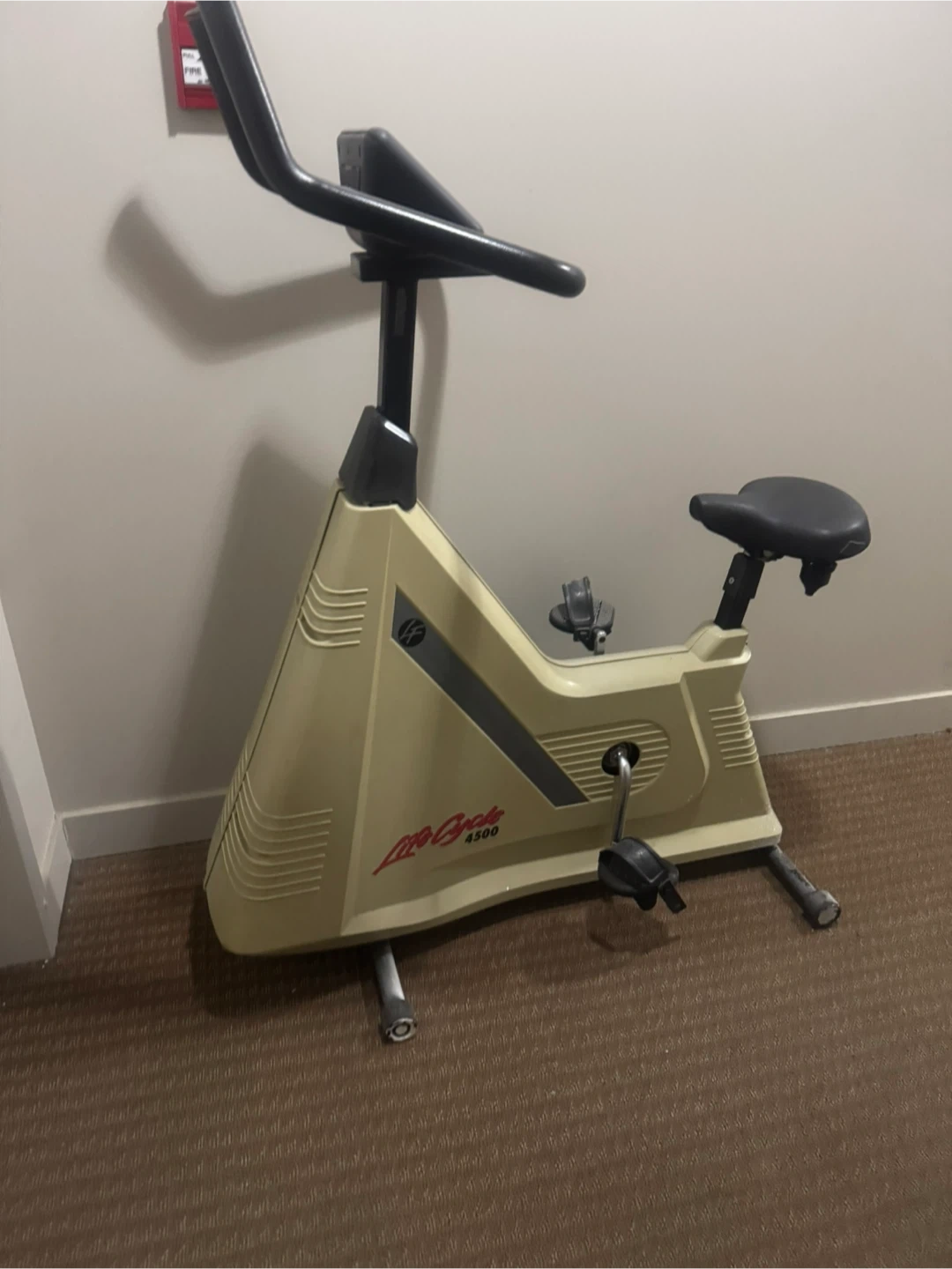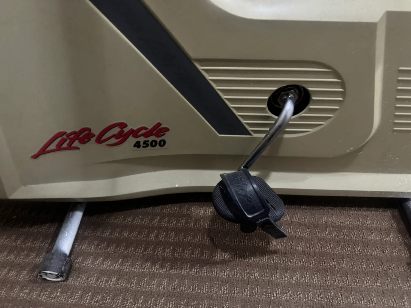 This is a Life Fitness 4500 stationary exercise bike. It includes a digital display showing time, RPM, level, and total calories. The bike has adjustable resistance levels.