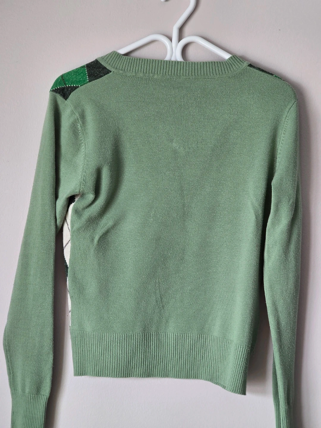 This is a green v-neck sweater featuring an argyle pattern on the front. It has long sleeves and a ribbed hem. 100% acrylic material.