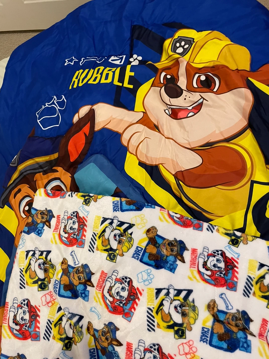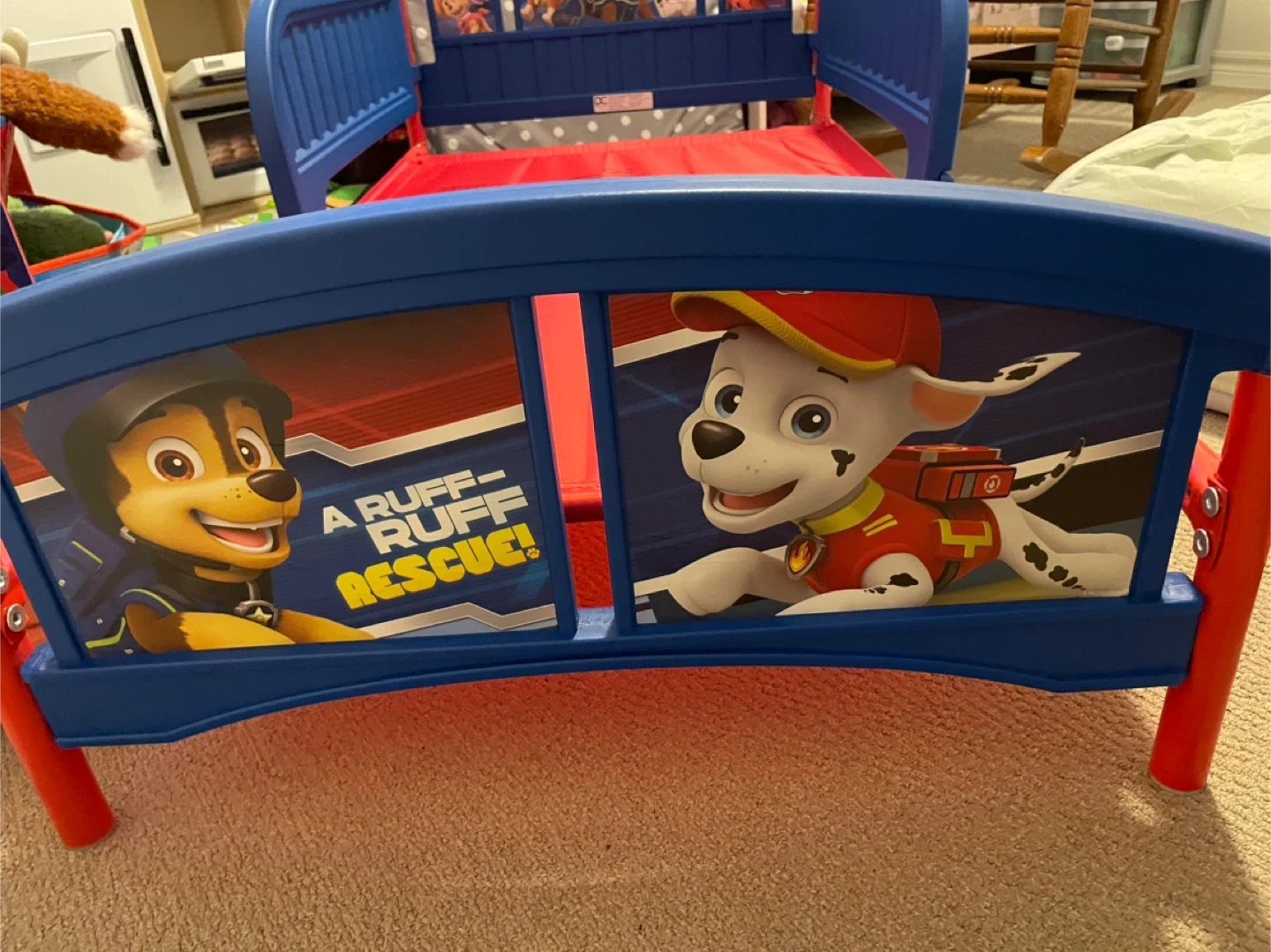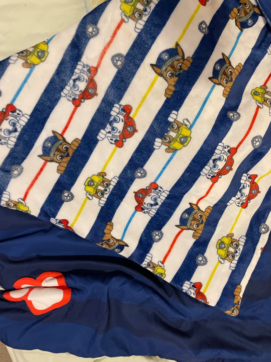 Toddler bed and 2 sets of sheets, fits a crib mattress each set has a fitted sheet, pillow case and comforter. each comforter has a fuzzy side that matches the fitted sheet