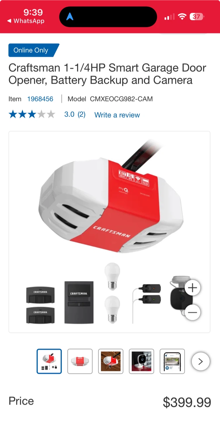 Selling a Craftsman 1-1/4HP Smart Garage Door Opener with Battery Backup and Camera! It's still in the box and includes all the components. This smart opener has a battery backup and camera for added security and convenience. INSTALLATION AVAILABLE AS WELL FOR AN ADDED FEE.