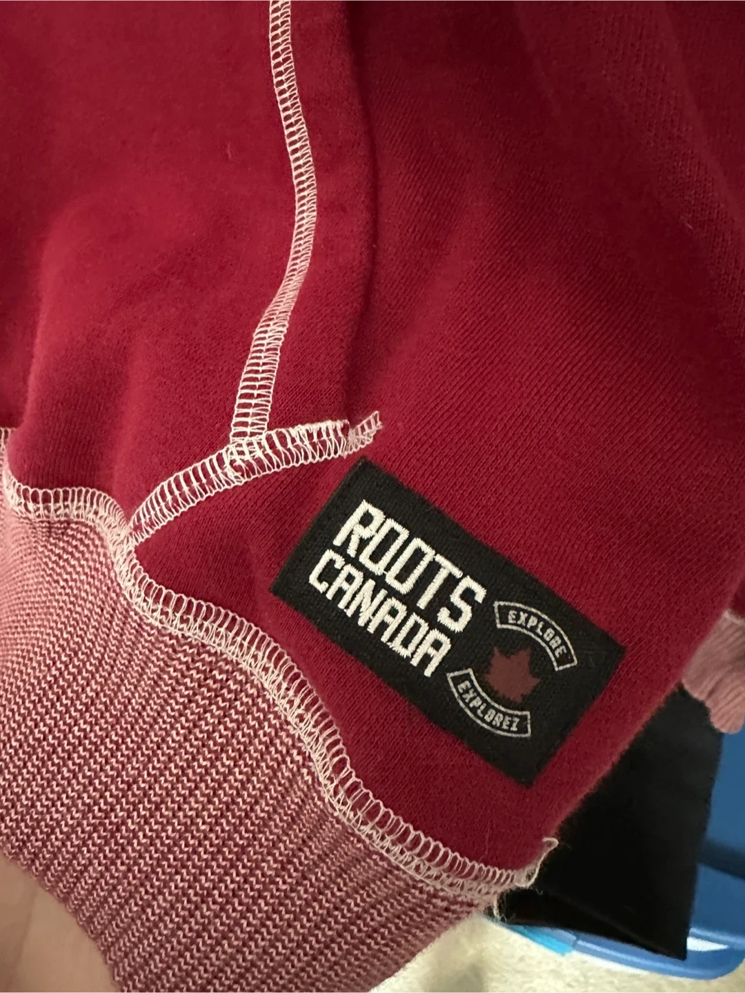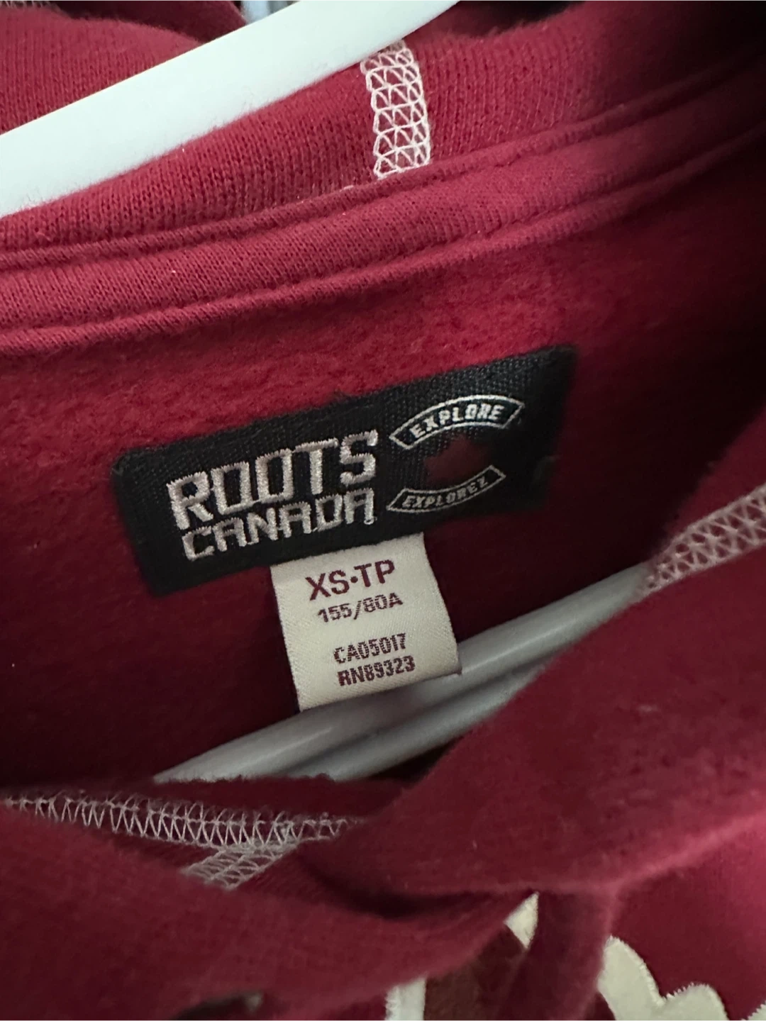 This is a Roots Canada red hoodie. It's size XS and features a maple leaf graphic with "Explore Canada" text on the sleeve. Made from a soft cotton blend.
