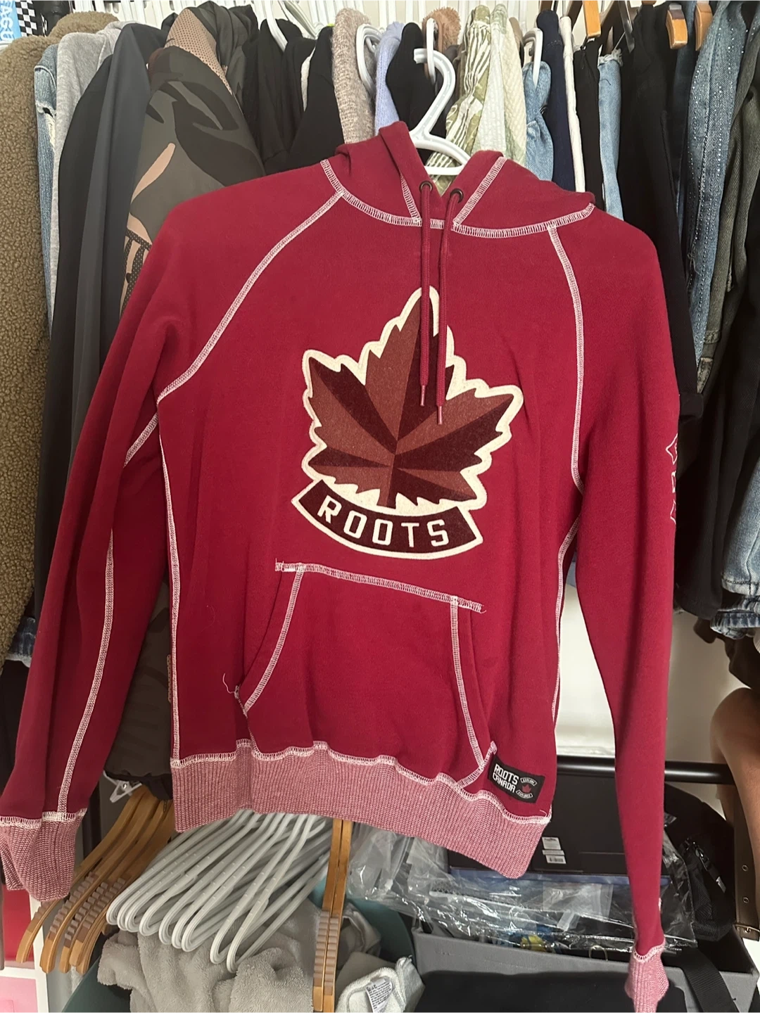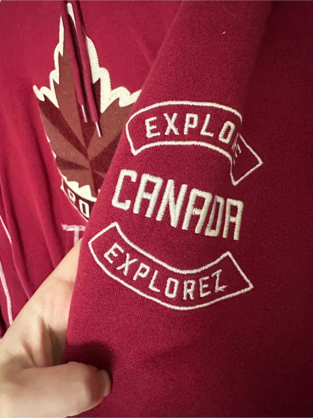 This is a Roots Canada red hoodie. It's size XS and features a maple leaf graphic with "Explore Canada" text on the sleeve. Made from a soft cotton blend.