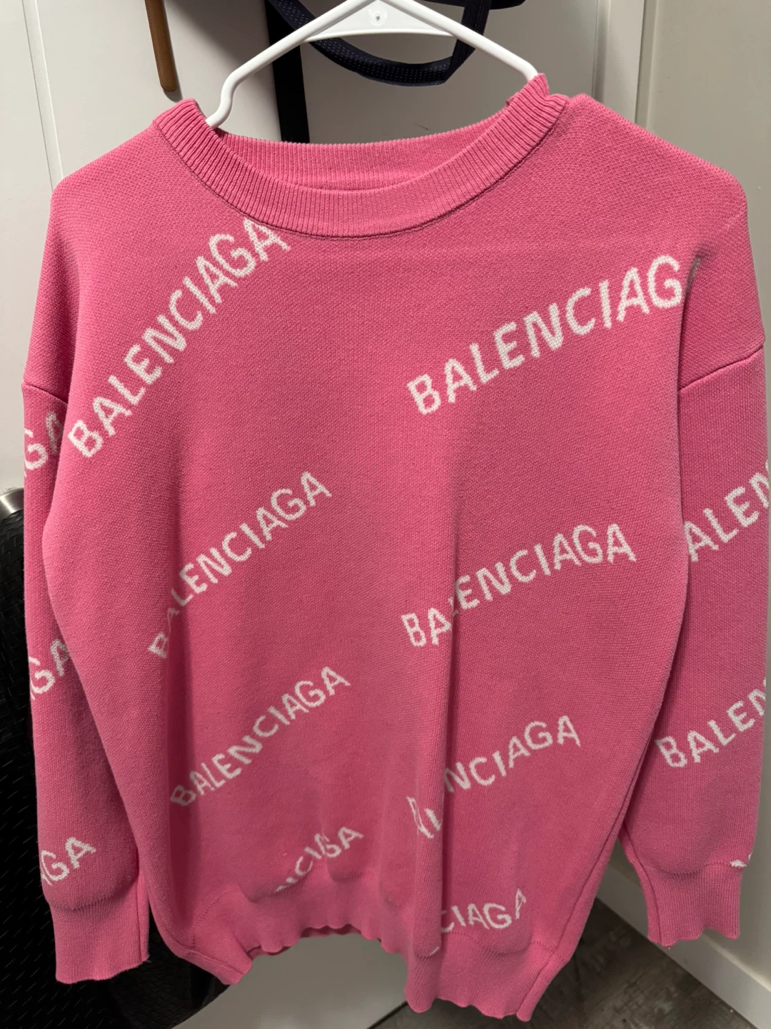 This is a Balenciaga knit sweater in a vibrant pink colour. It features an all-over white Balenciaga logo print. Made from a knit material, it's perfect for adding a stylish statement to your outfit.