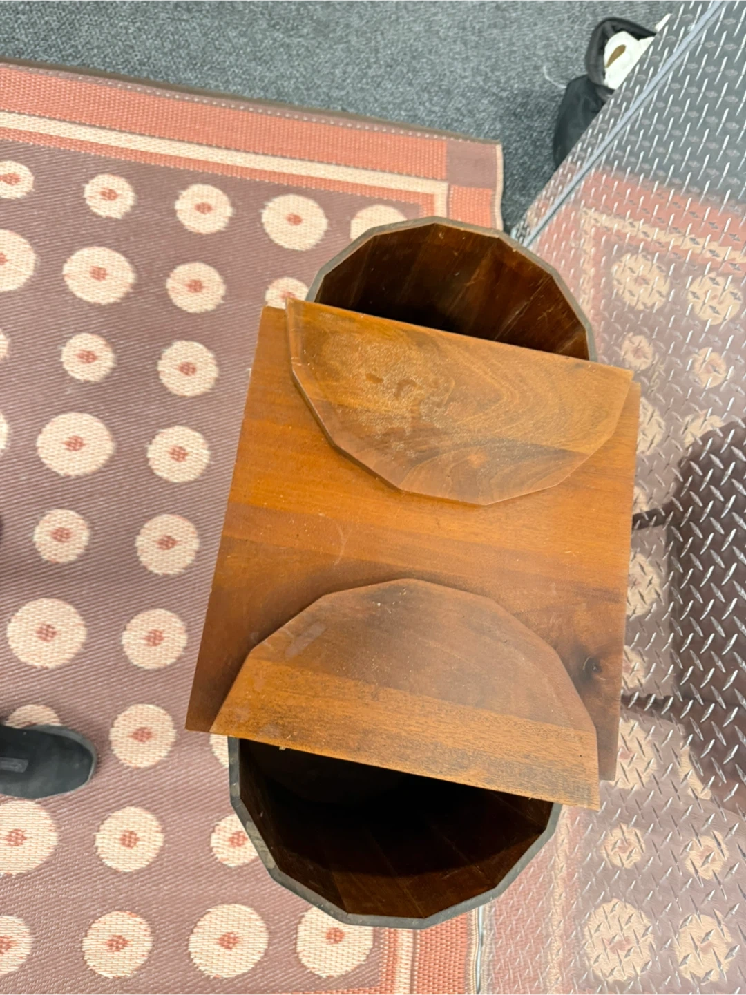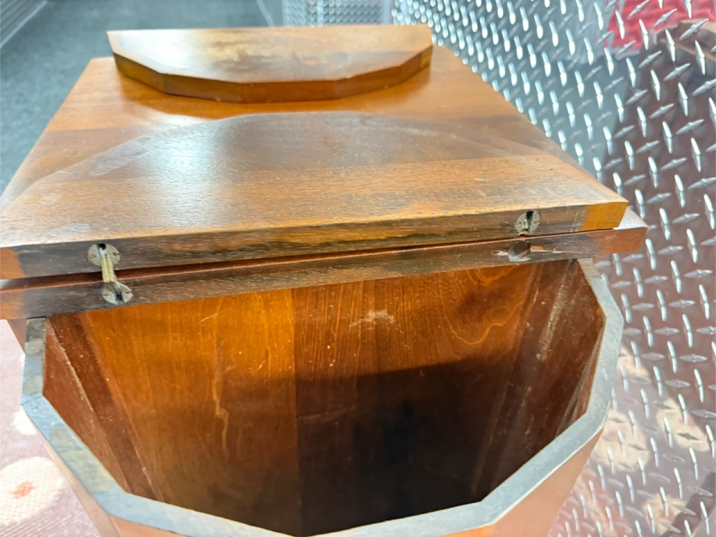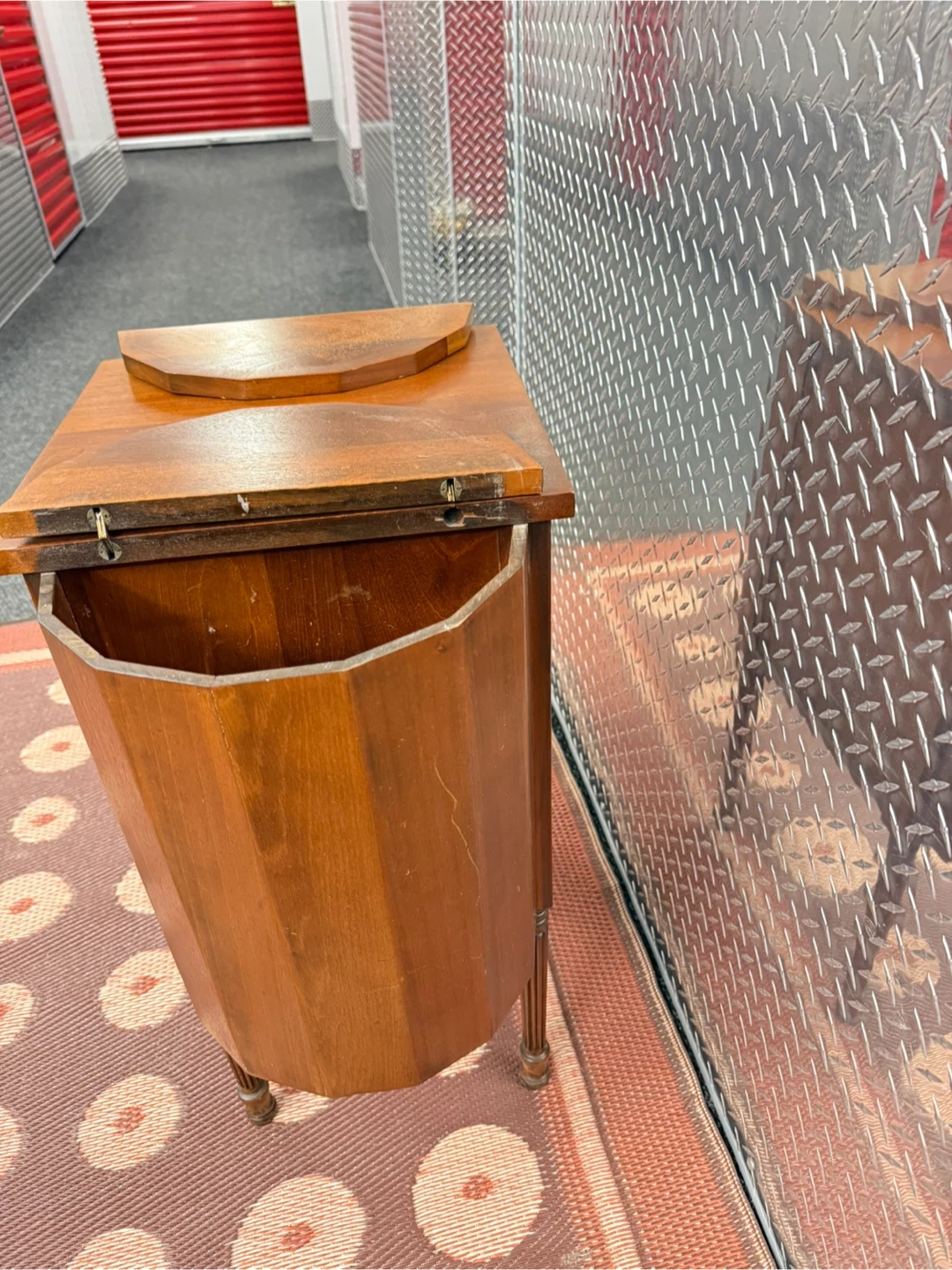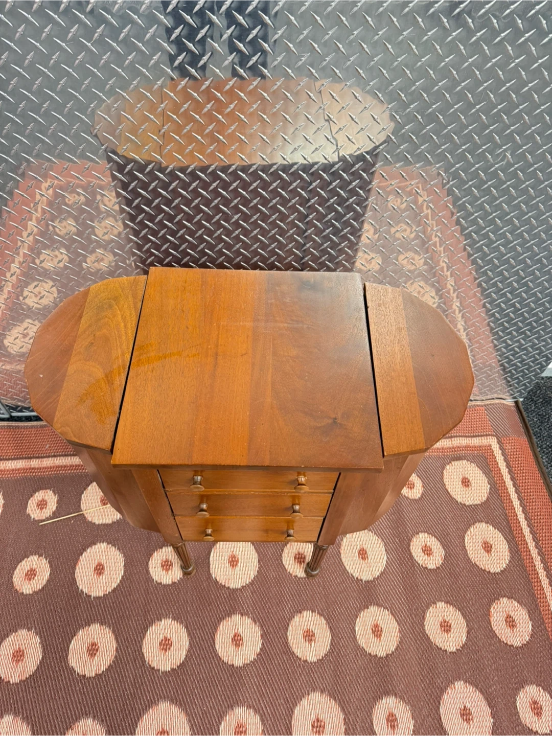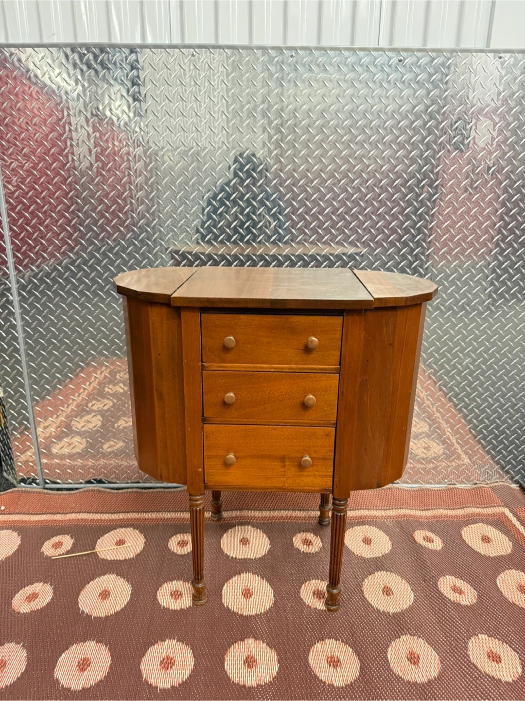 This is a wooden sewing basket with a table top. It features three drawers and two compartments that open from the top. The wood has a warm, natural finish. This piece is perfect for storing sewing supplies or other small items!