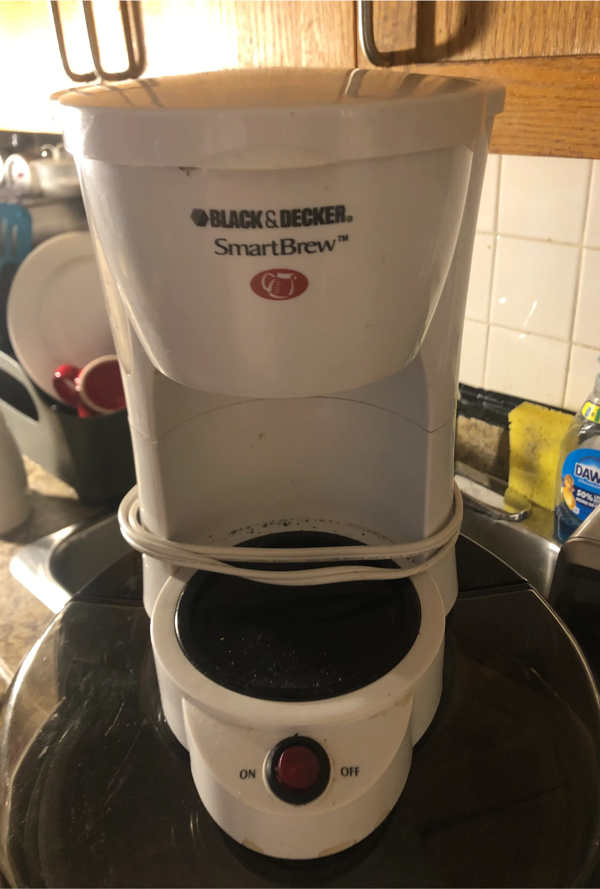 This is a white Black & Decker SmartBrew coffee maker. It has an on/off switch with a red indicator light. This coffee maker is perfect for making a single cup of coffee.