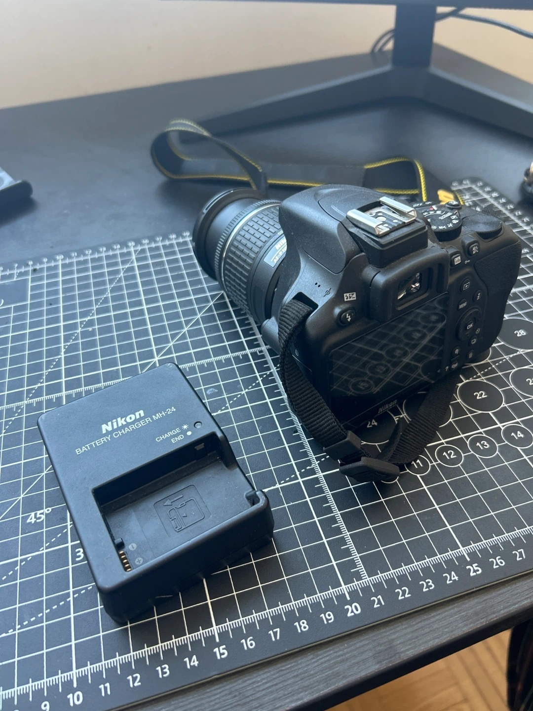This is a Nikon D3500 DSLR camera with its original battery charger. It's a great camera for beginners and enthusiasts alike. The charger is a Nikon MH-24 model.