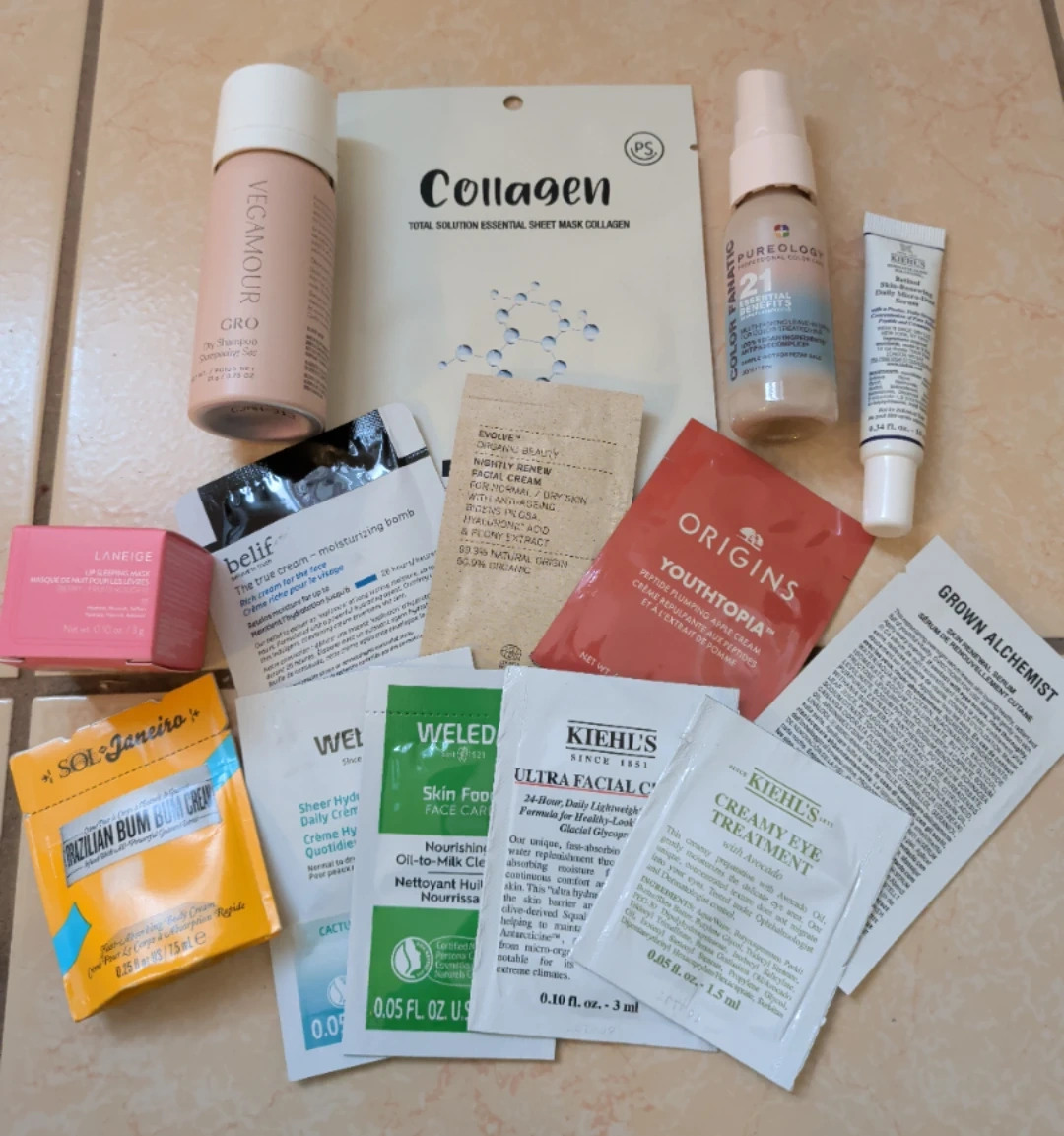 A collection of various skincare sample: dry shampoo, some facial creams, lip sleeping mask, Color Fanatic spray, Collagen sheet mask.