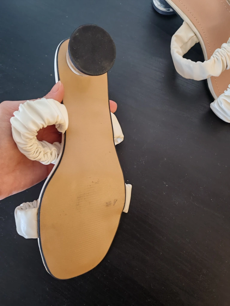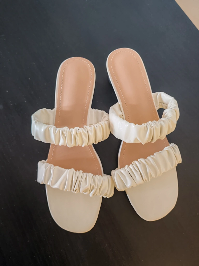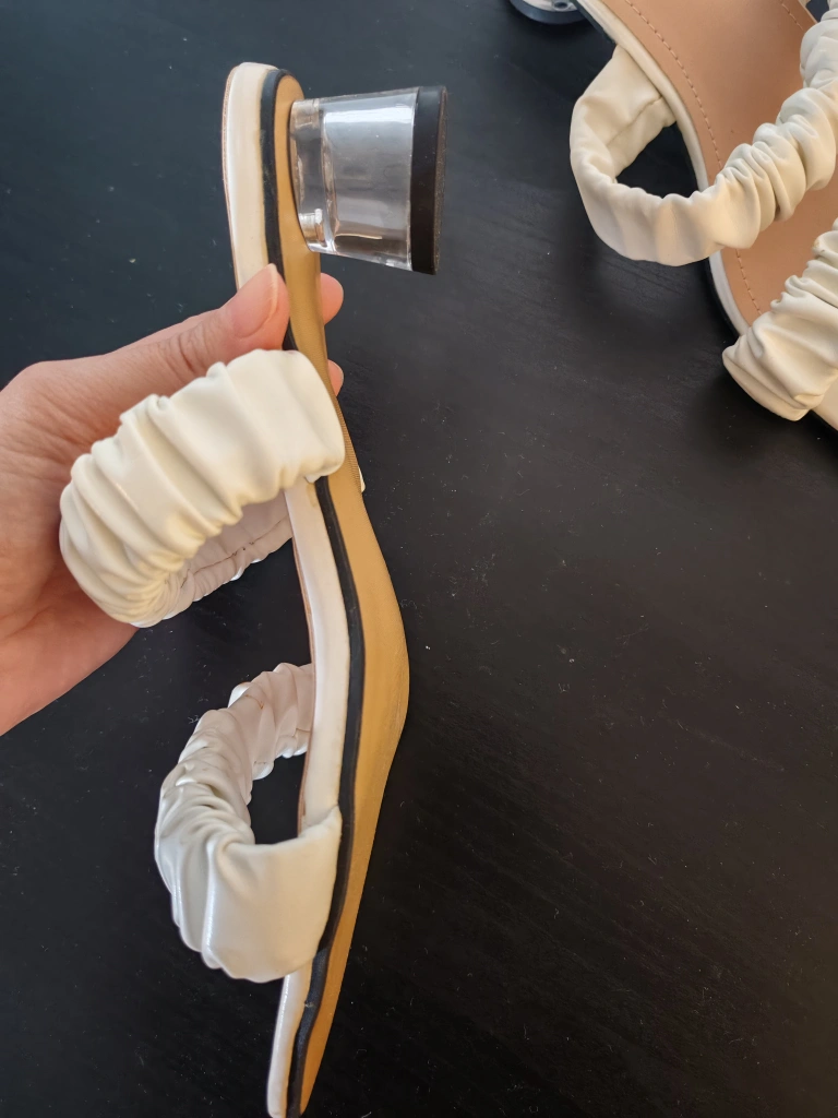 These stylish white sandals feature a comfortable block heel and trendy ruched straps across the vamp. The open-toe design and light tan footbed make them perfect for warmer weather. Heel height appears to be around 2 inches. Size EU 40 (US9)