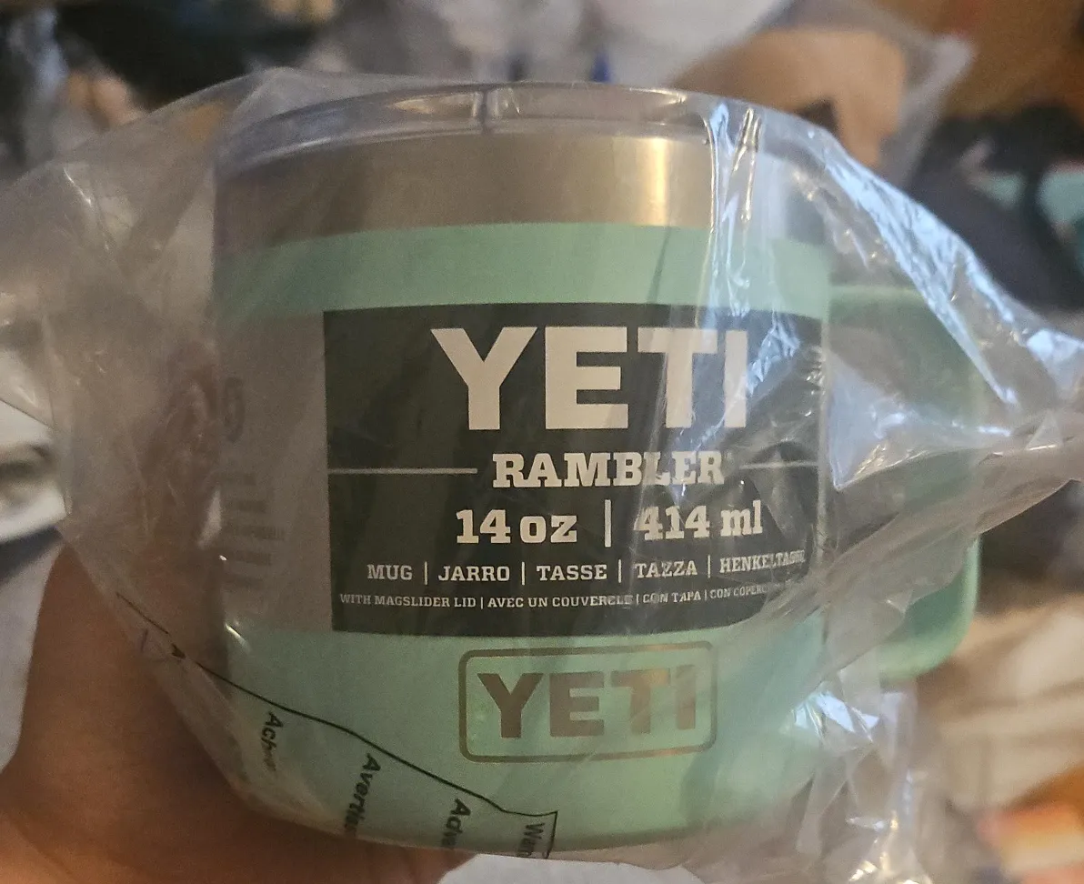 This is a Yeti Rambler 14 oz mug. It's a 414 ml capacity and comes with a MagSlider lid.