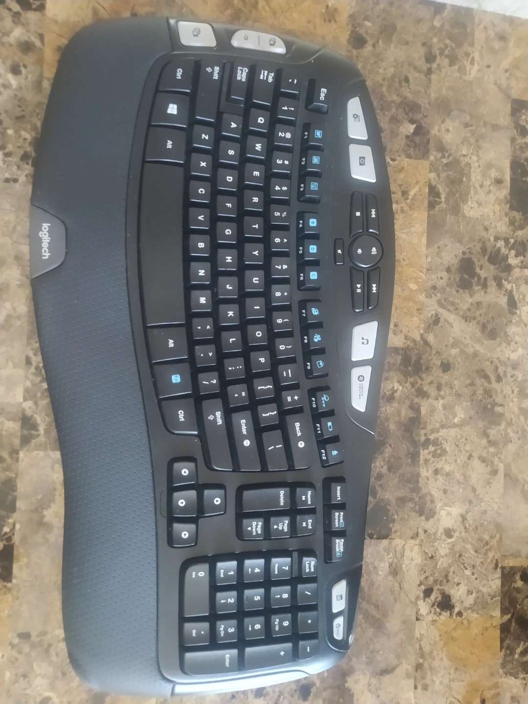 This is a black Logitech K350 wireless ergonomic keyboard. It's designed for comfortable typing with a sculpted shape. Includes a USB receiver.But it isn't in a working condition.