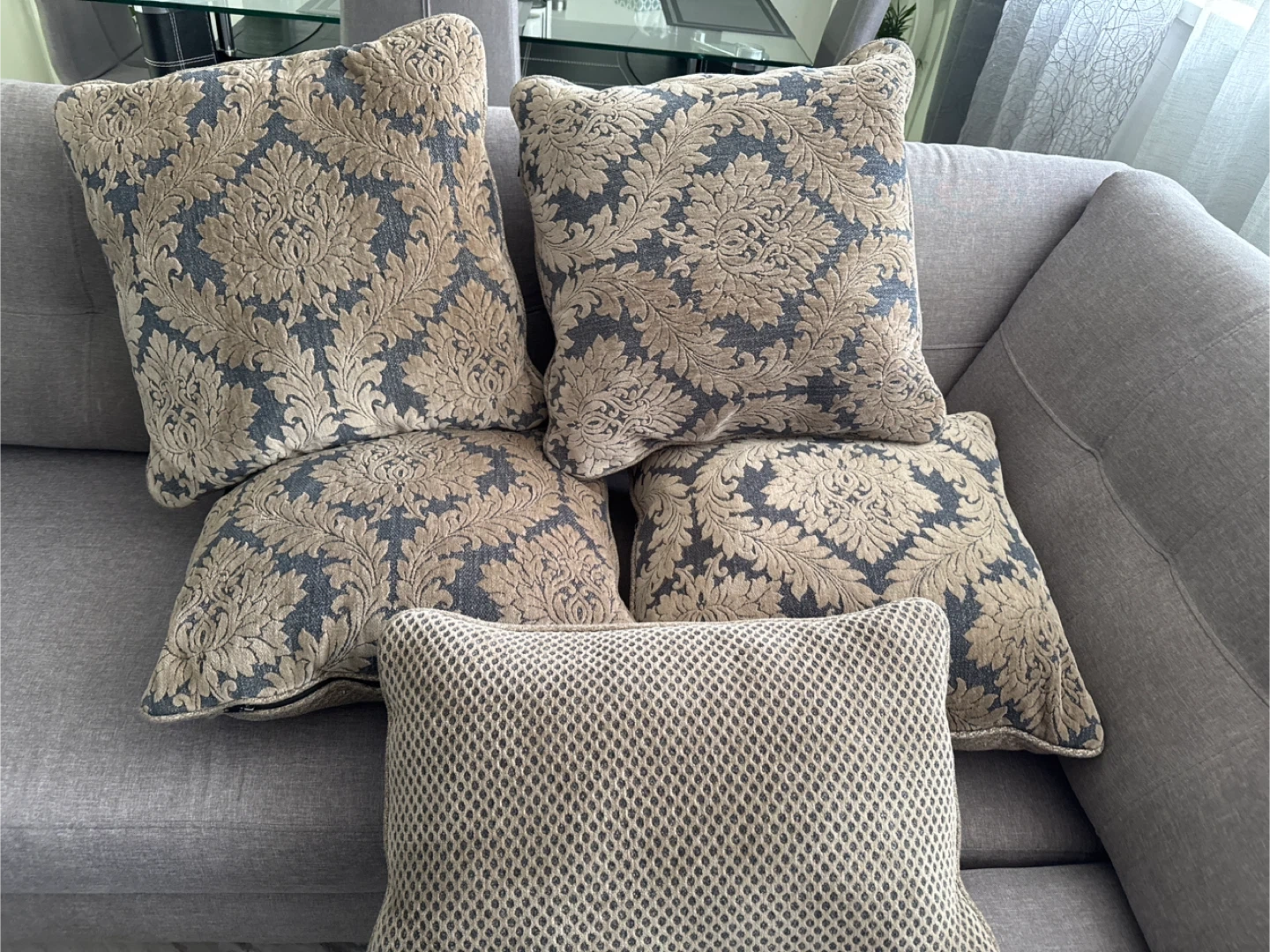 Four patterned throw pillows and one textured pillow. Damask pattern in beige and dark grey. One pillow has a visible zipper. Adds a touch of elegance to any sofa or chair!
