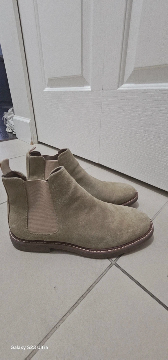 Selling a pair of beige suede Chelsea boots. They're in good condition and would be a great addition to your wardrobe. Easy to slip on and off, and the suede gives them a nice, soft look