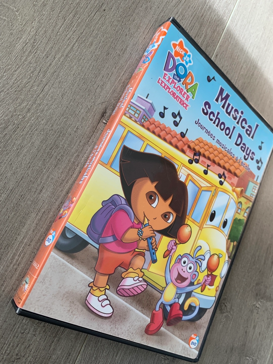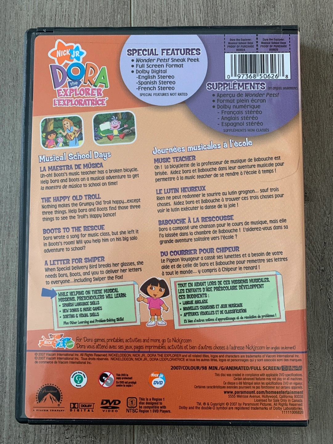 Pre-owned Dora the Explorer DVD. Features multiple episodes. Includes special features. English and French language options. Suitable for preschoolers.