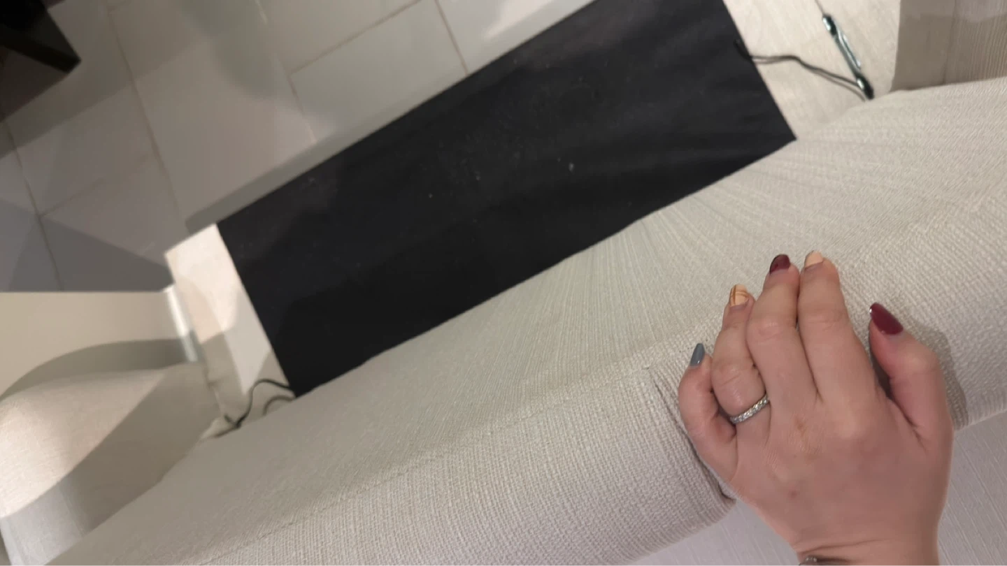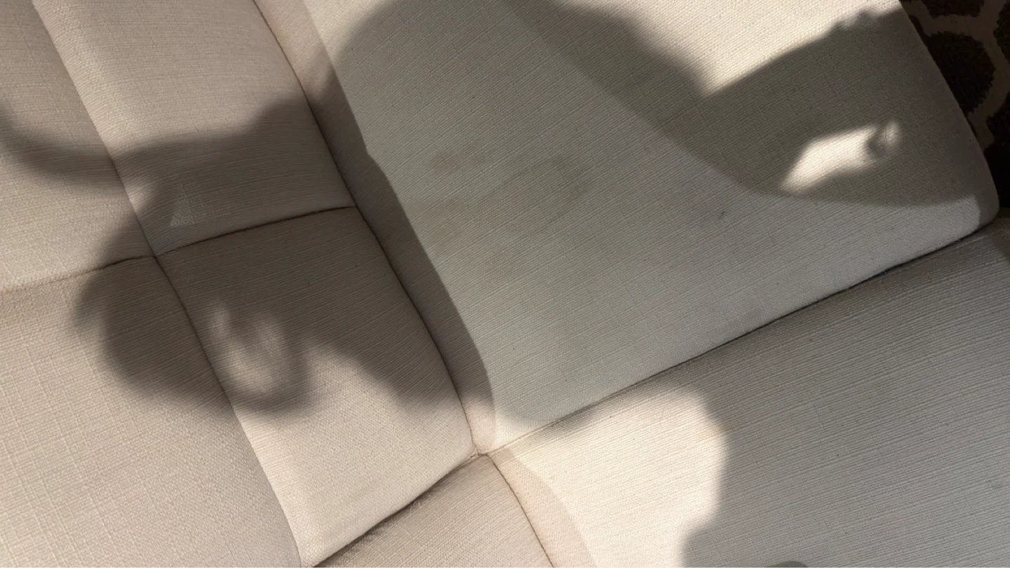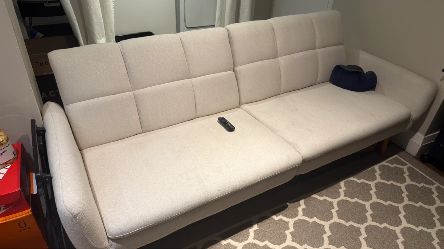 Cream coloured futon sofa with a linen-like fabric. It easily converts from a sofa to a bed. Fabric material with wood legs.