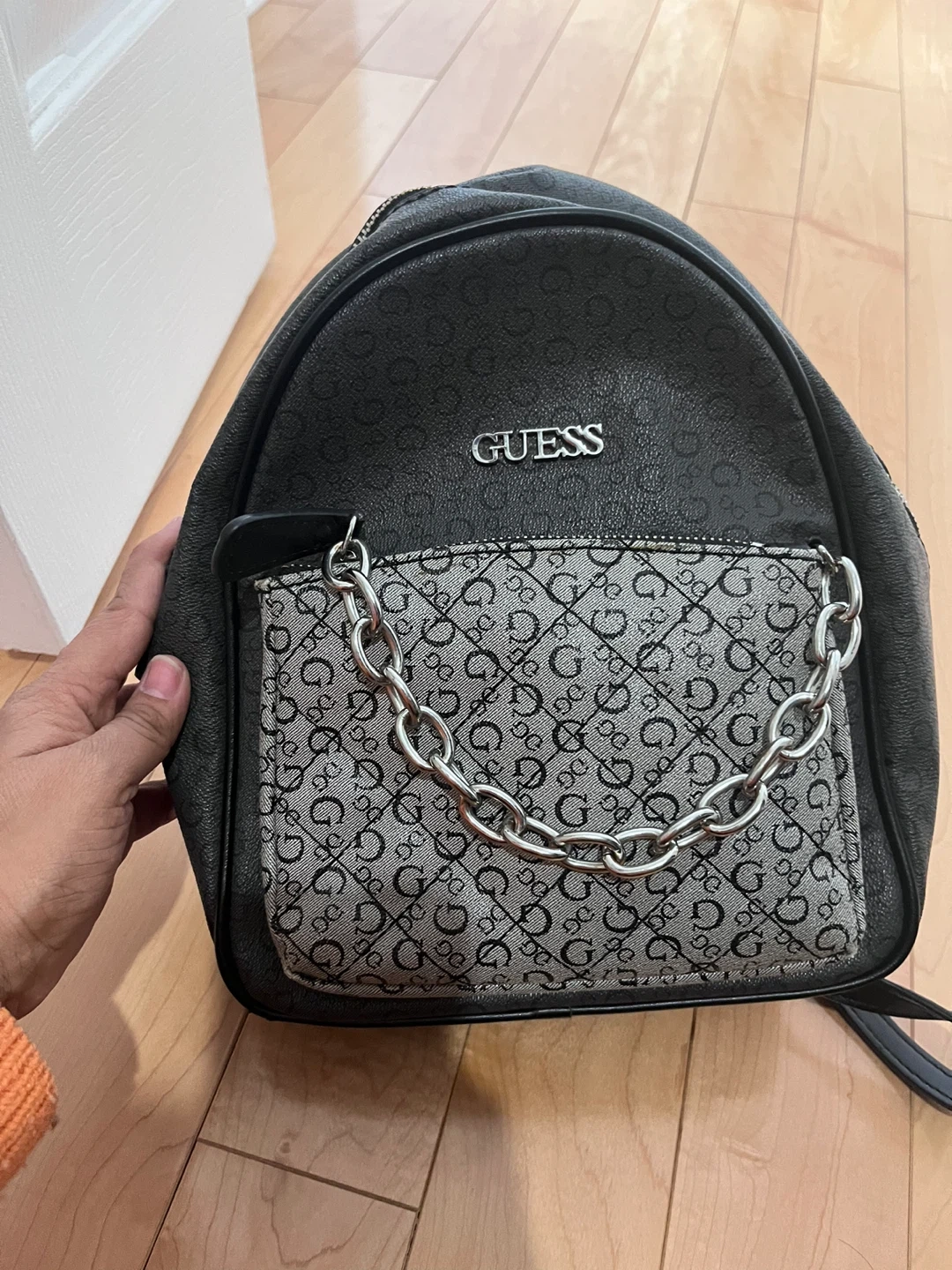 This is a stylish GUESS black backpack. It features a front pocket with a decorative silver chain. The interior is black and includes multiple compartments for organization. It's a great accessory for everyday use!