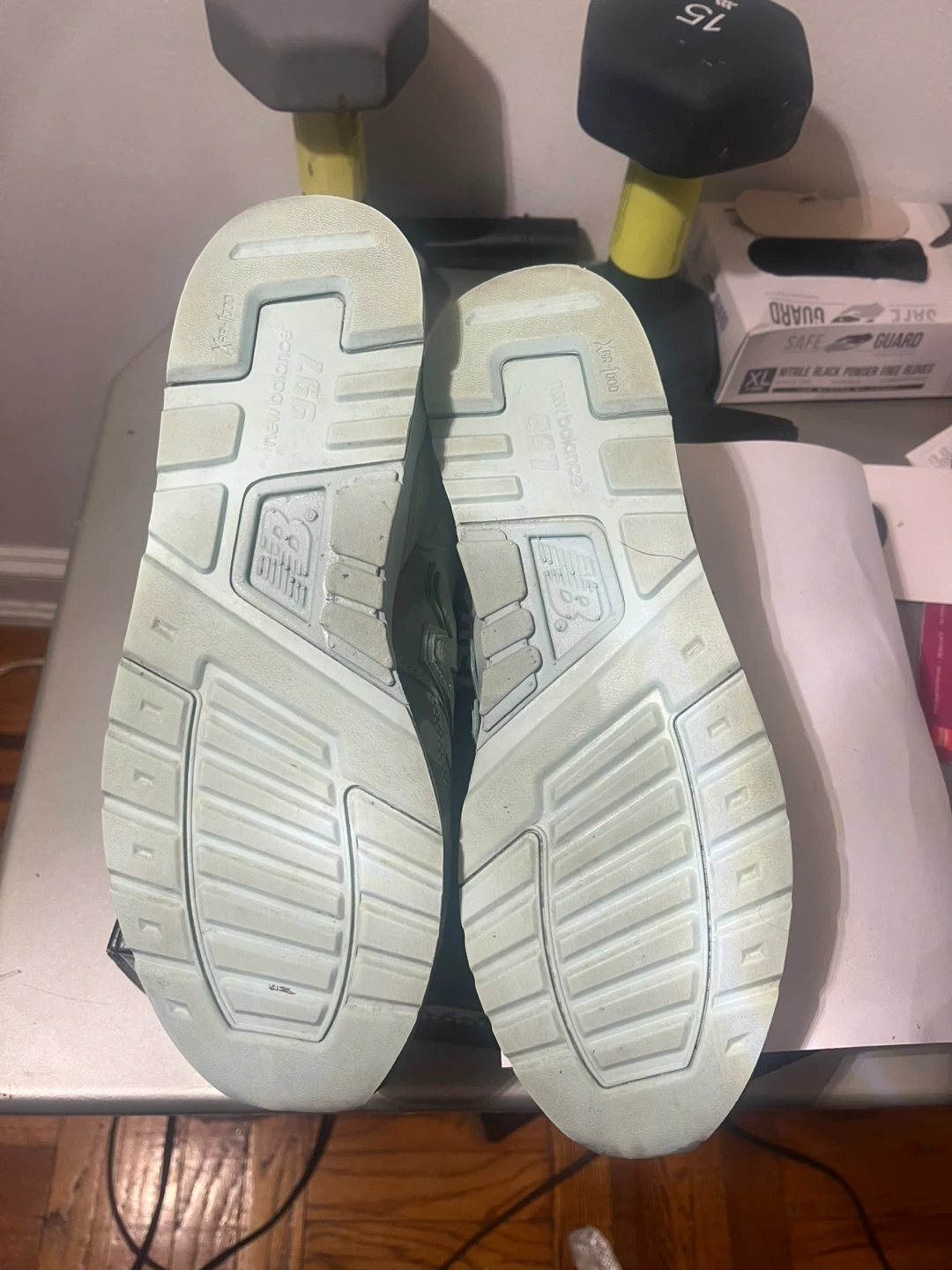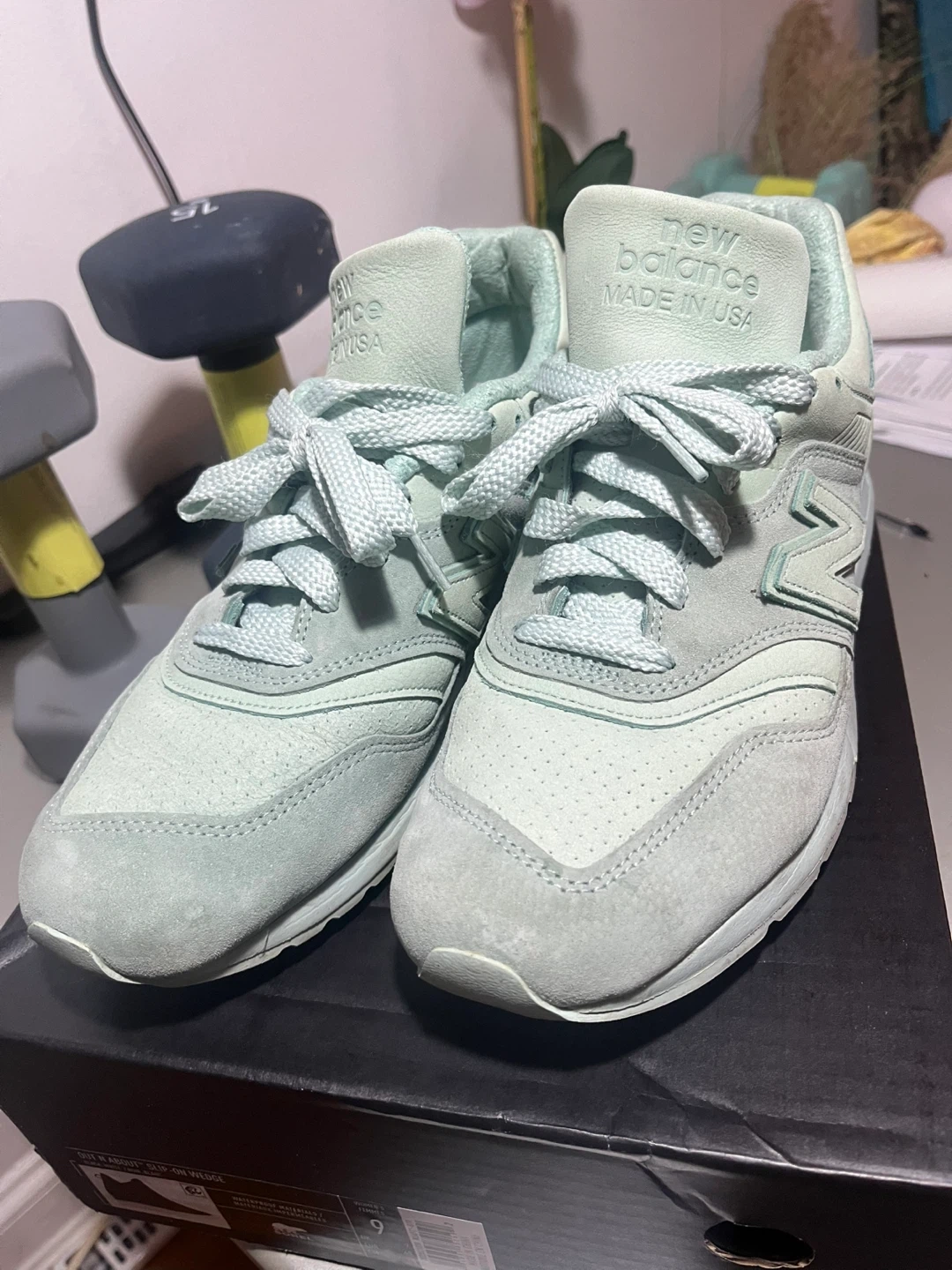 New Balance 997 sneakers in a soft sea salt and mint green colorway. These shoes are made in the USA and feature a durable suede and mesh construction. ENCAP midsole for cushioning and support. Size 9. 1/2
