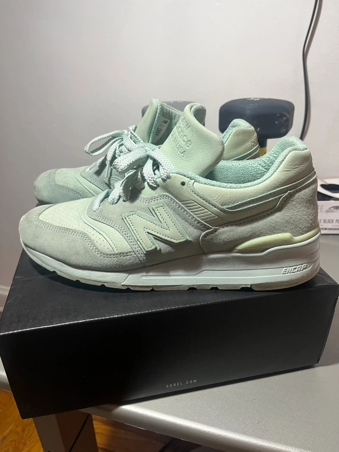 New Balance 997 sneakers in a soft sea salt and mint green colorway. These shoes are made in the USA and feature a durable suede and mesh construction. ENCAP midsole for cushioning and support. Size 9. 1/2