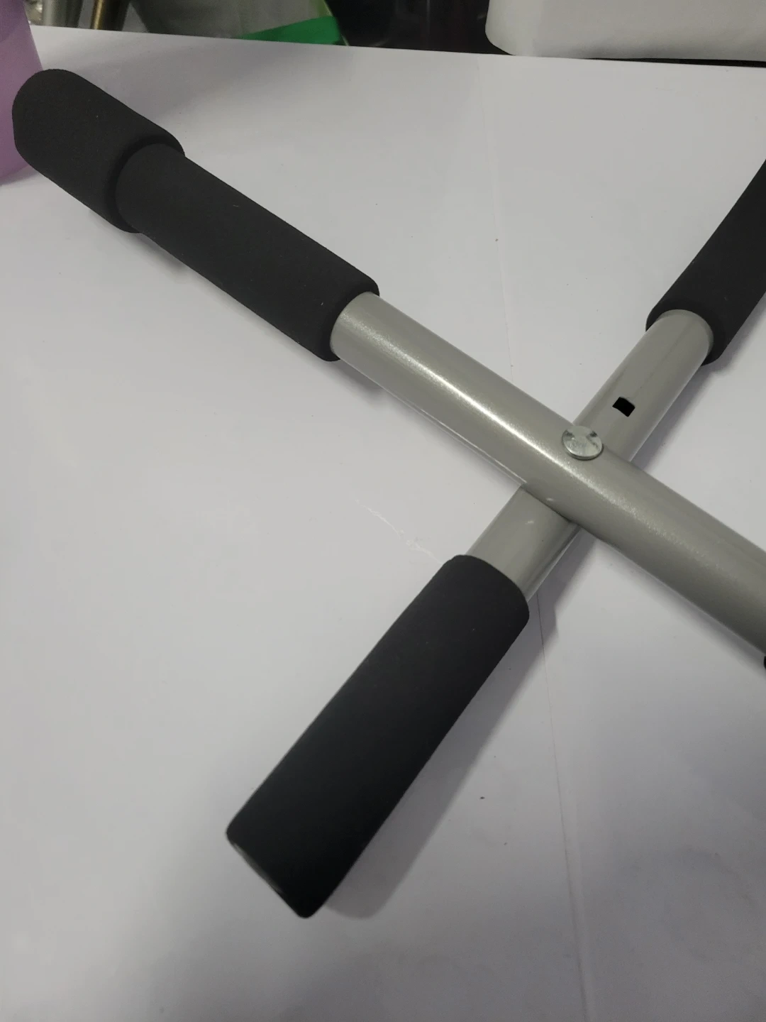 This is the Iron Gym Total Upper Body Workout Bar. It attaches and removes from door frames in seconds, no drilling or tools needed. Heavy duty steel construction with foam grips. The bar is new but the bix is in poor condition.