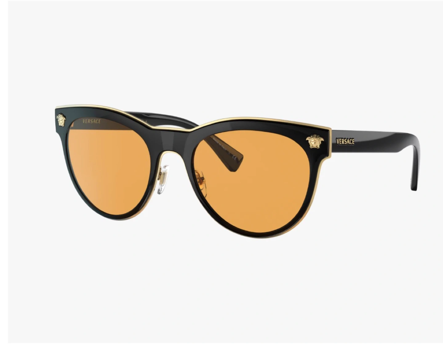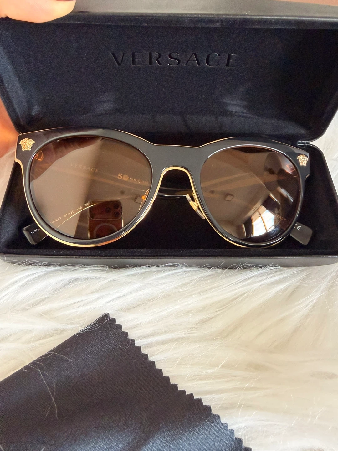 These Versace sunglasses feature a stylish black and gold cat-eye frame with vibrant orange lenses. They come with the original Versace hard case and a cleaning cloth.