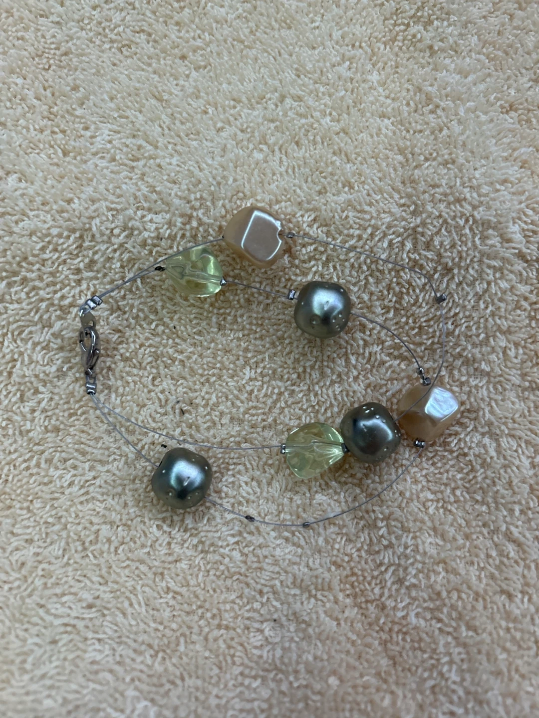 This bracelet features a mix of grey pearls, light green faceted beads, and nude cube beads. It's strung on clear elastic cord with a silver-tone clasp. Measures approximately 7 inches.