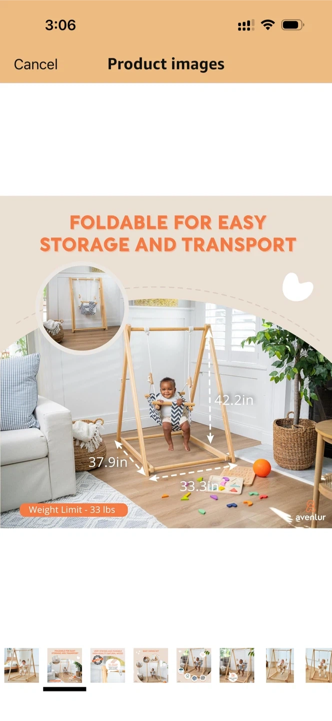 This is a wooden baby swing with a fabric seat. It's foldable for easy storage and transport. The weight limit is 33 lbs. Dimensions are 37.9in wide, 33.3in deep, and 42.2in tall.