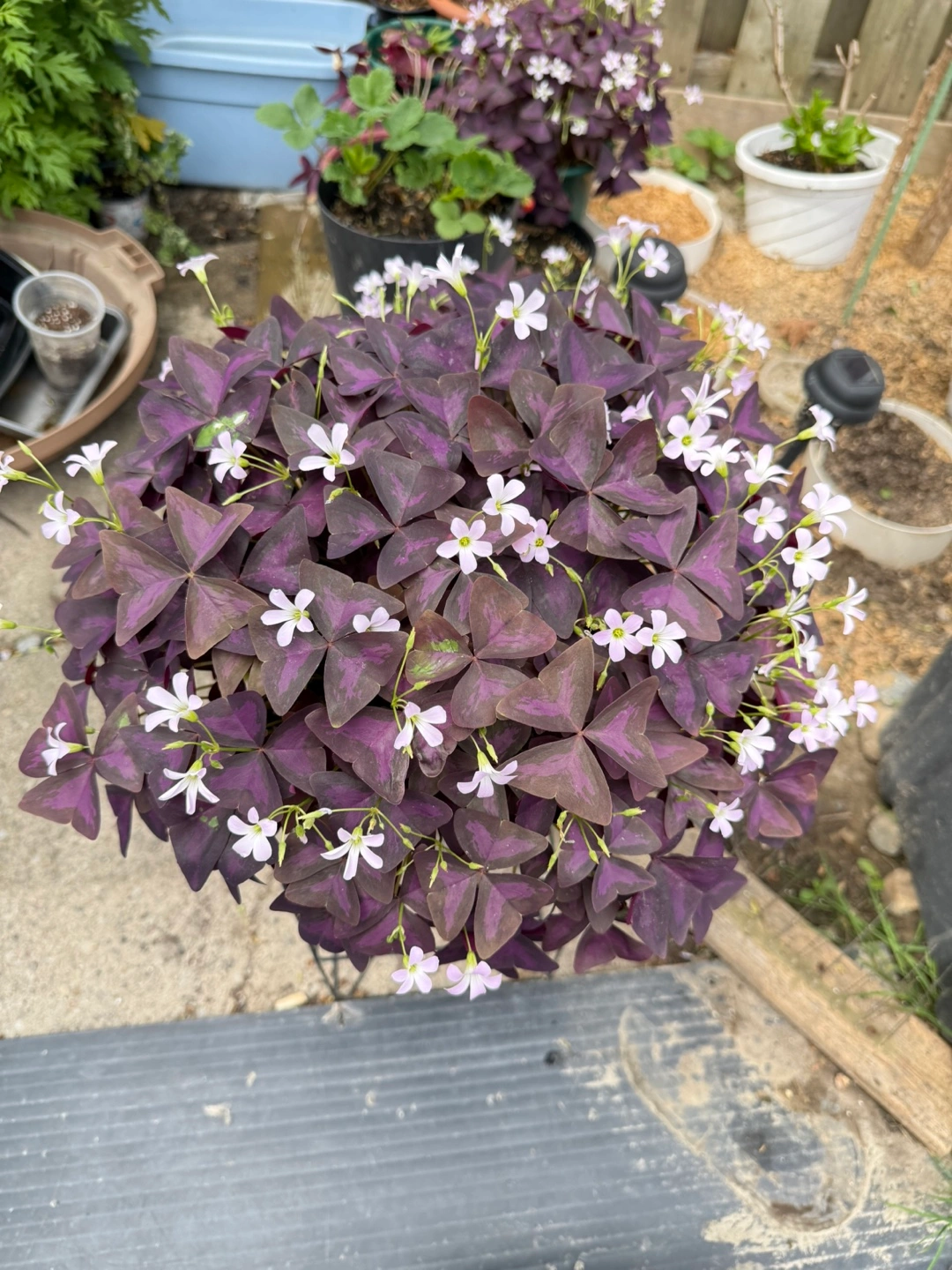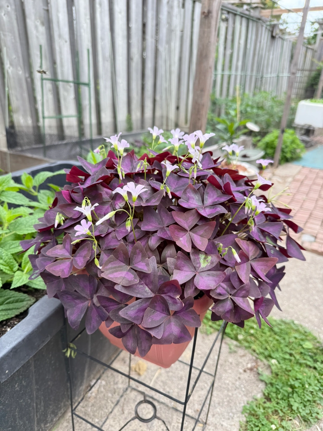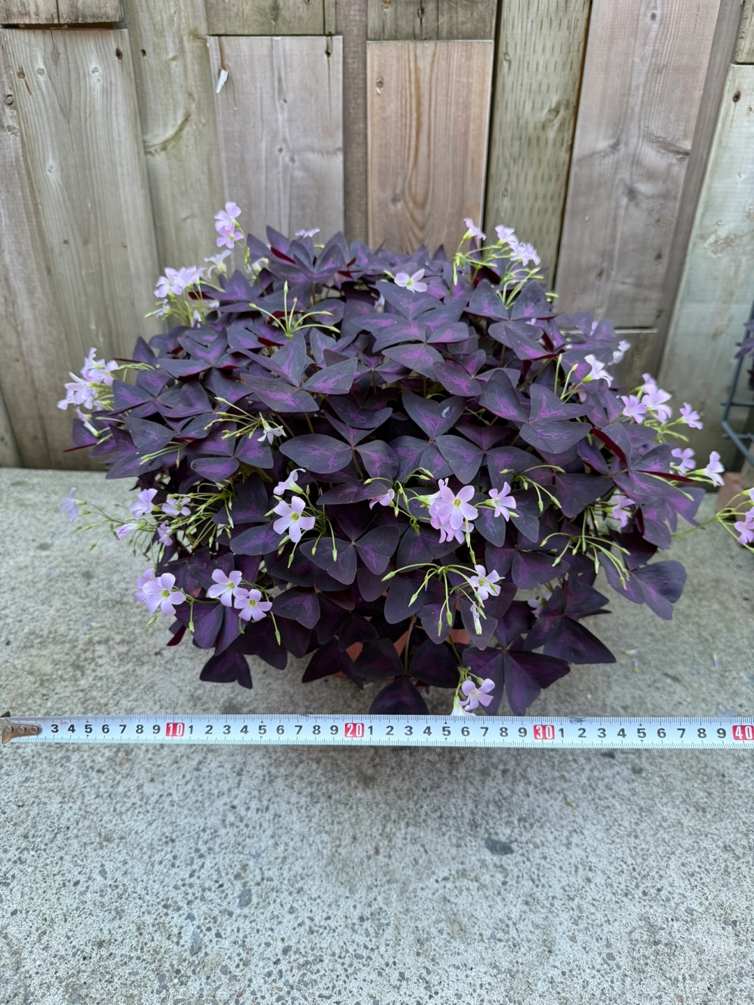 Beautiful, full purple shamrock plant. The leaves look like butterflies. It has some flowers on it, too. It is such a peaceful plant to have and will be a welcome addition to any garden.