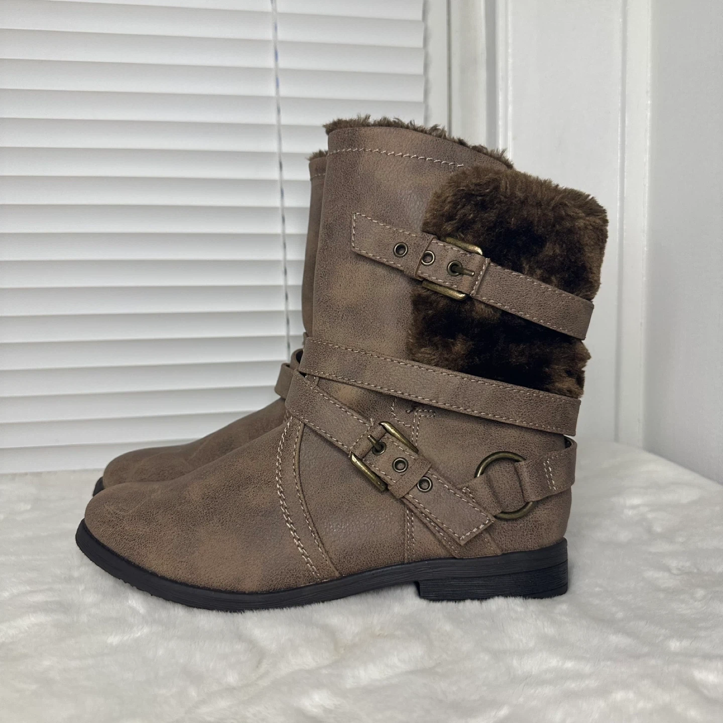 These stylish winter boots are perfect for keeping your feet warm and cozy! They feature a faux suede exterior with faux fur trim. The boots also have adjustable buckle straps for a secure and comfortable fit. Great for cold weather!