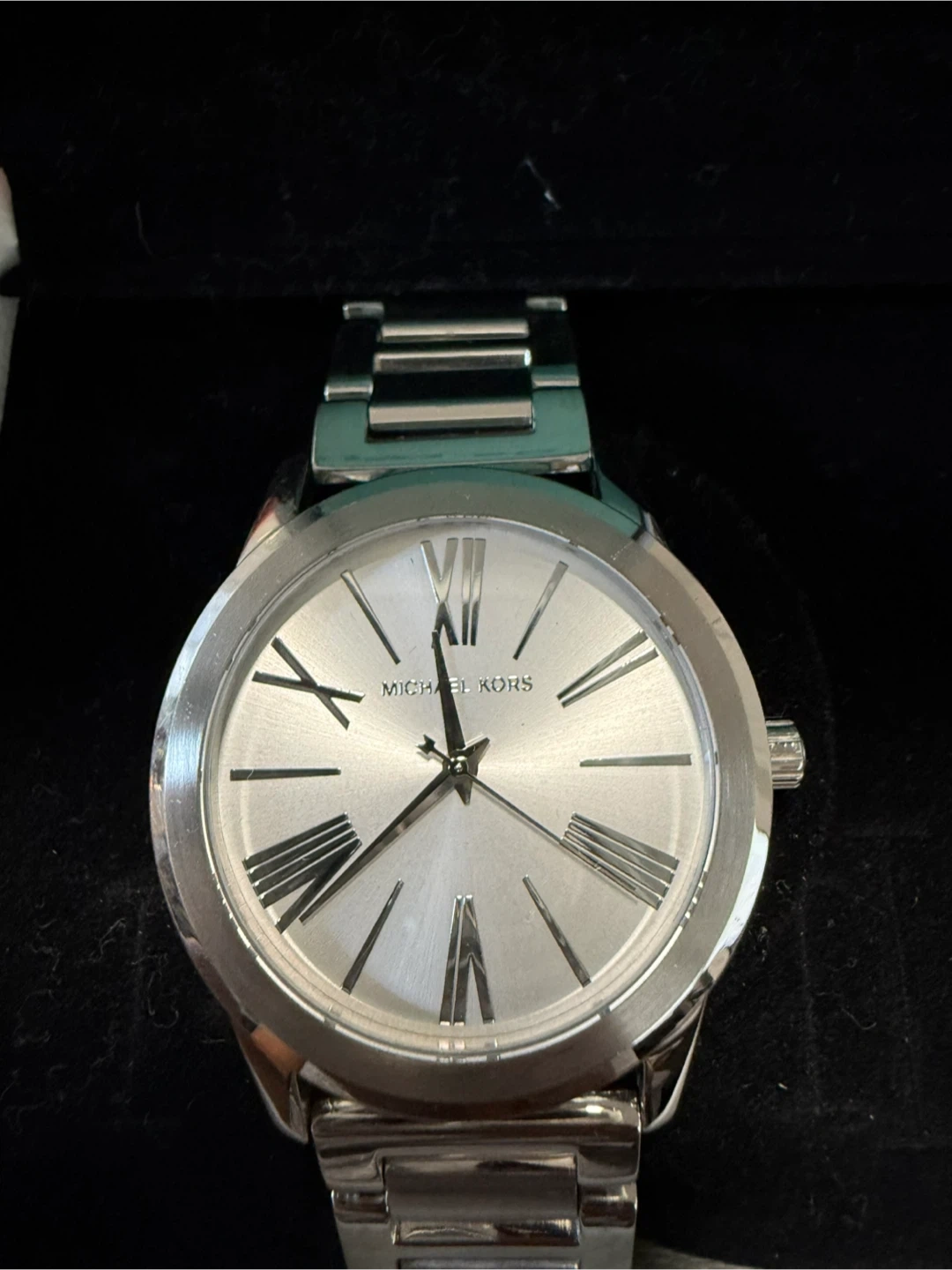 Selling a stylish Michael Kors women's watch in silver. It's in great condition and ready to add a touch of elegance to your wrist! Needs new battery. Sized to fit myself. Have original links.
