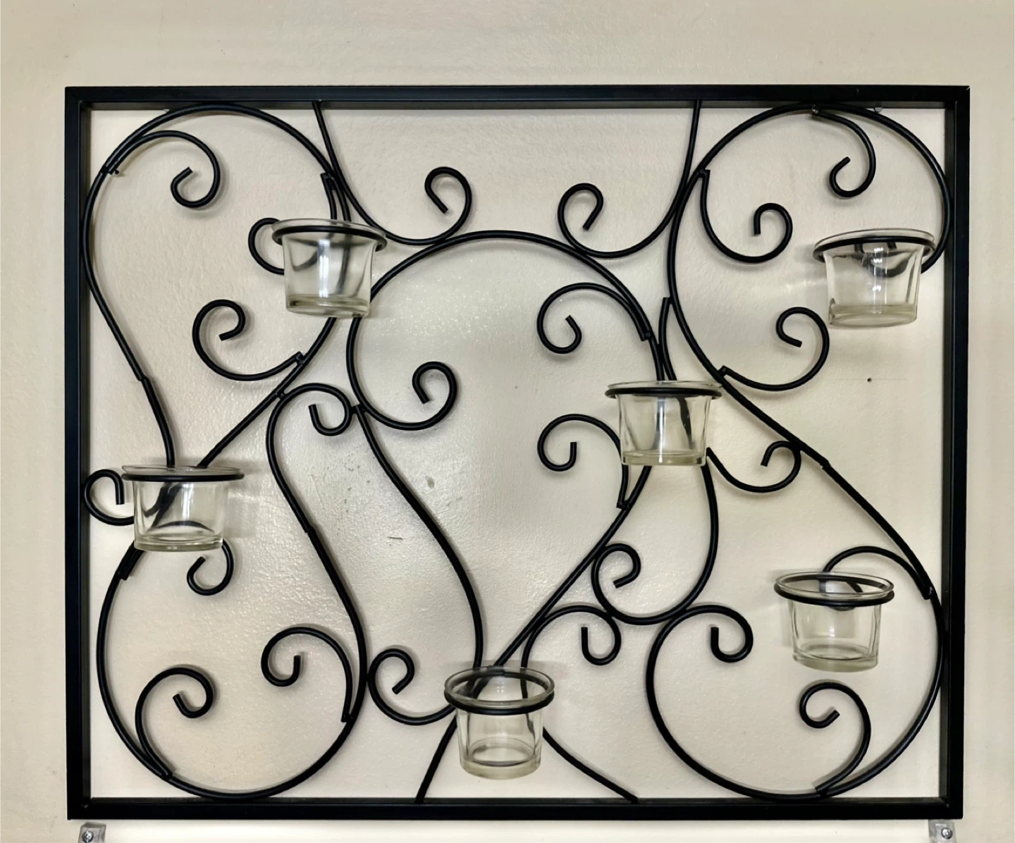 Selling a metal wall decor piece with 6 glass candle holders. It's a unique item that could add a nice touch to any room. Please note that one of the glass holders has a small chip.