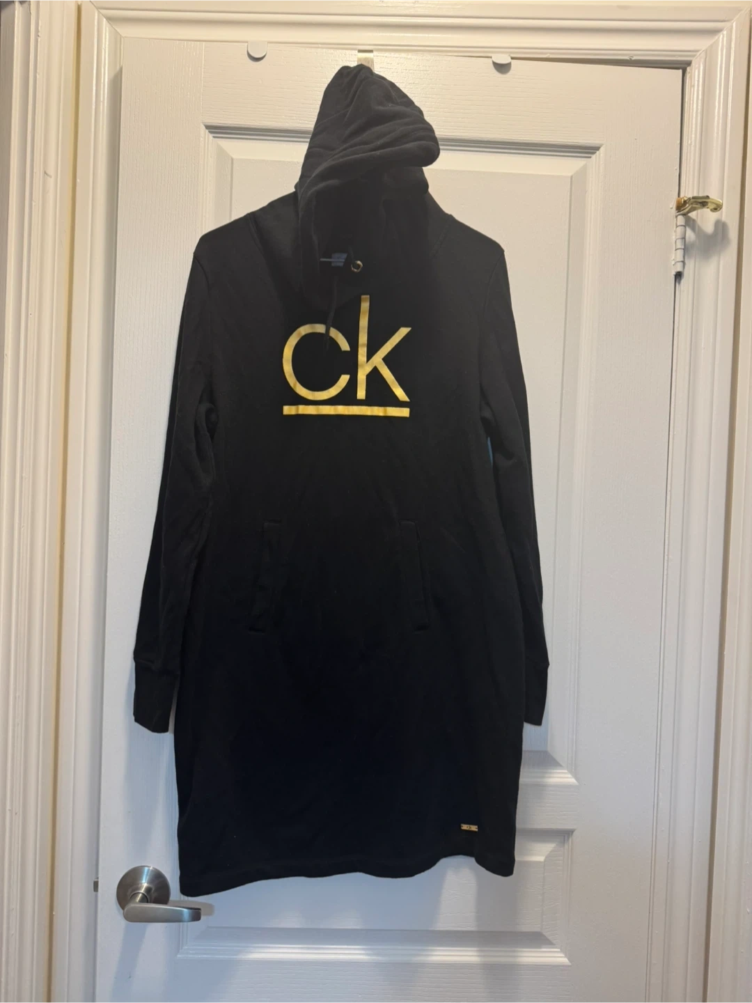 Selling a Calvin Klein hoodie dress in black. It's in good condition and ready for a new home! Perfect for casual wear or layering during cooler days.