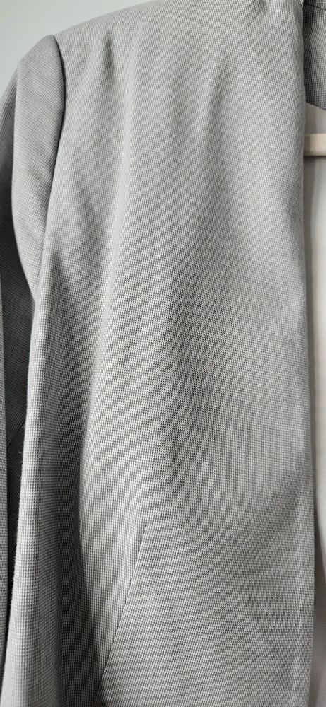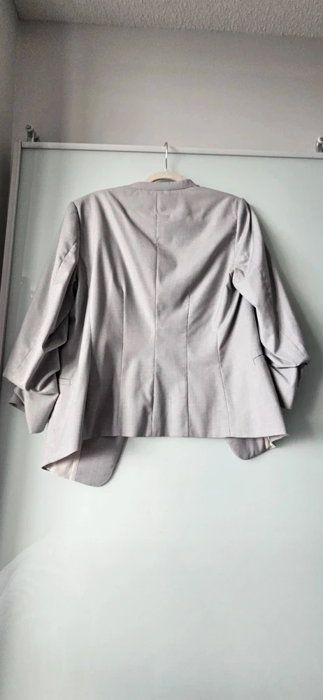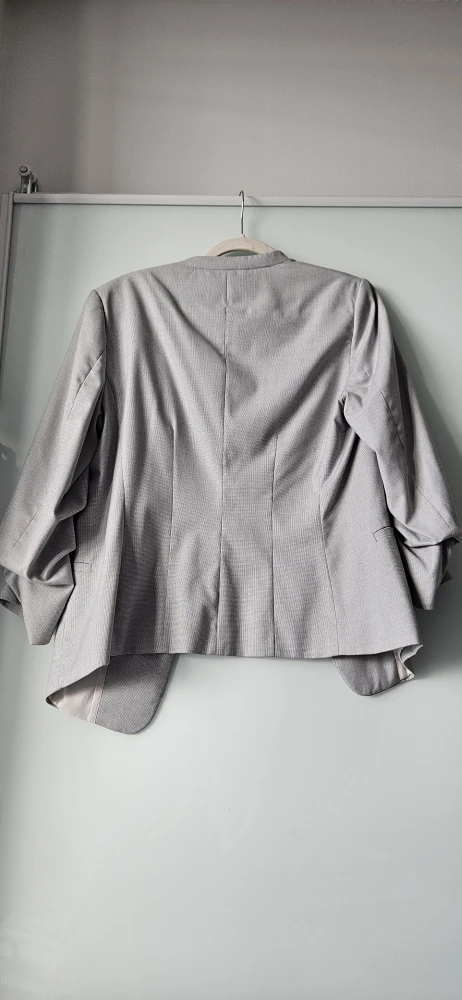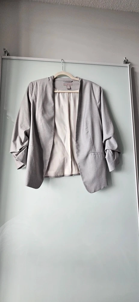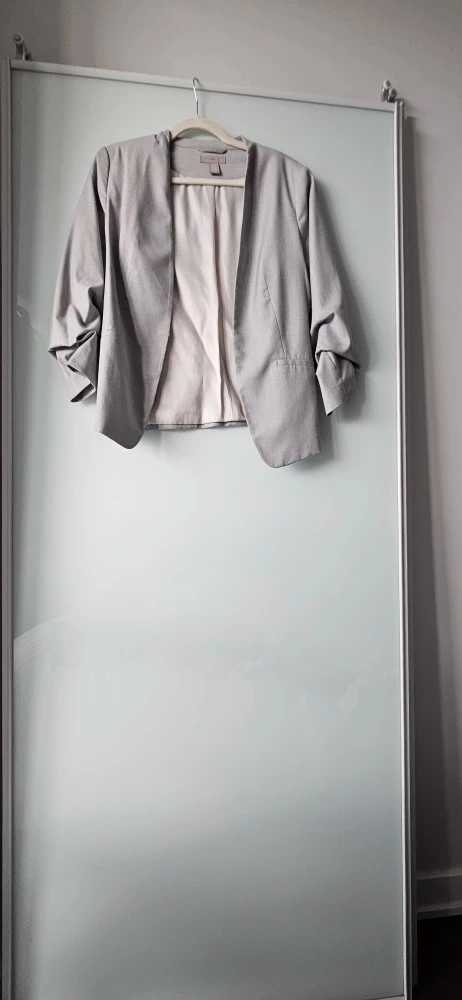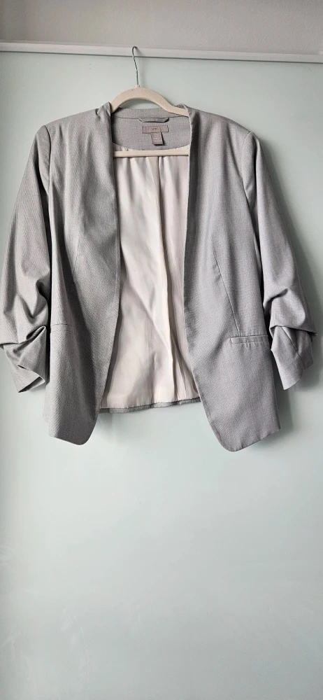 Selling an H&M blazer in light grey, size Medium (size 10). It features a stylish design with ruched sleeves and a comfortable fit, perfect for adding a touch of sophistication to any outfit. In fantastic condition. Great for both work, an evening out, or a casual look.