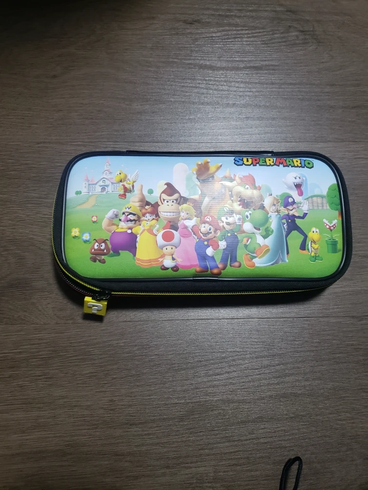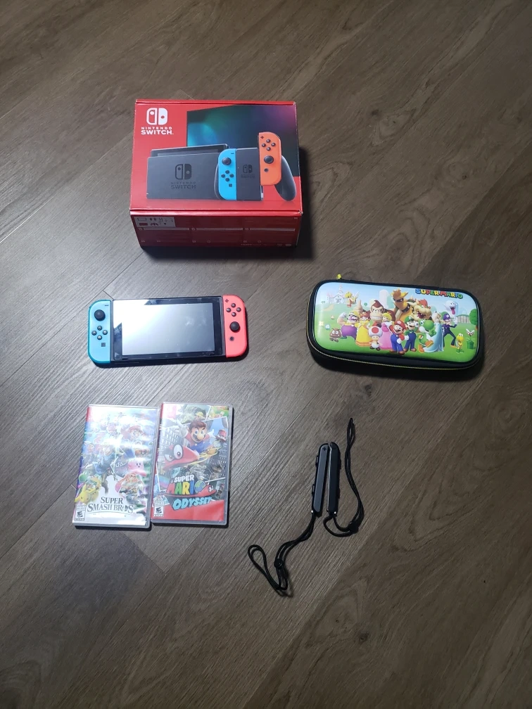 Selling a Nintendo Switch console with 2 games wich are super smash bros and super mario odessy It comes with a carrying case featuring Super Mario characters. The console is in great condition and includes all original components and box
