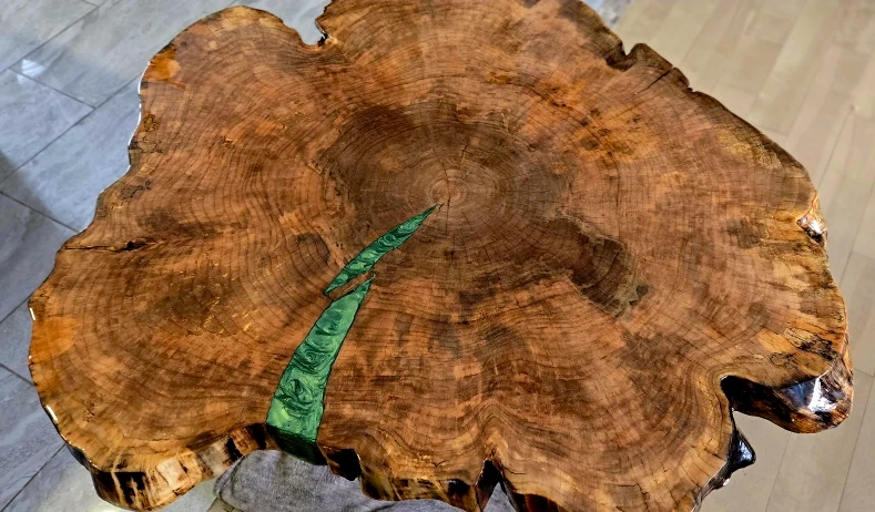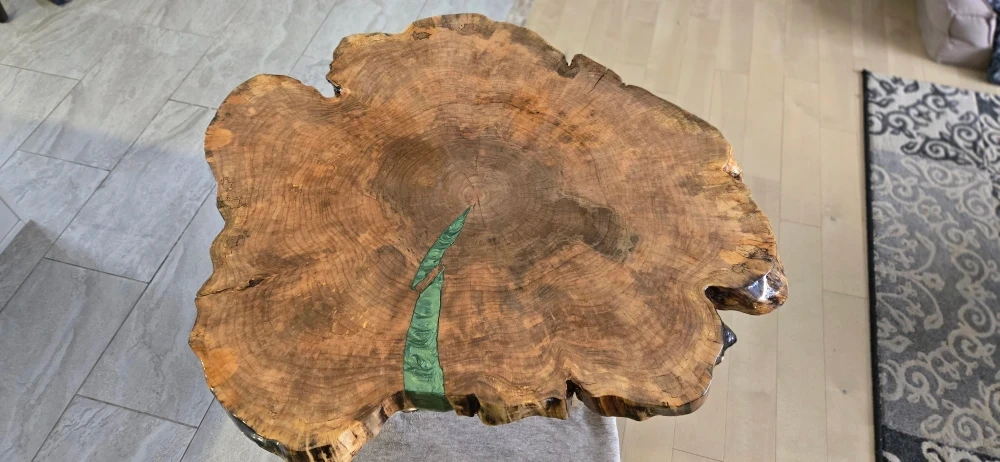 A stunning 46 by 40 inch spalted maple cookie, finished to a deep, reflective gloss that captures every detail of the grain and spalting. The green resin inlay adds a refined artistic contrast, making this piece visually commanding from any angle.