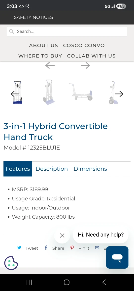 Selling a Cosco 3-in-1 Hybrid Convertible Hand Truck, model 12325BLU1E. This hand truck is great for both indoor and outdoor use and has a weight capacity of 800 lbs. Originally bought for $189.99.
