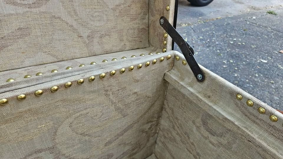 Details: Original hinges and latches intact. Leather side handles show vintage wear but remain attached.