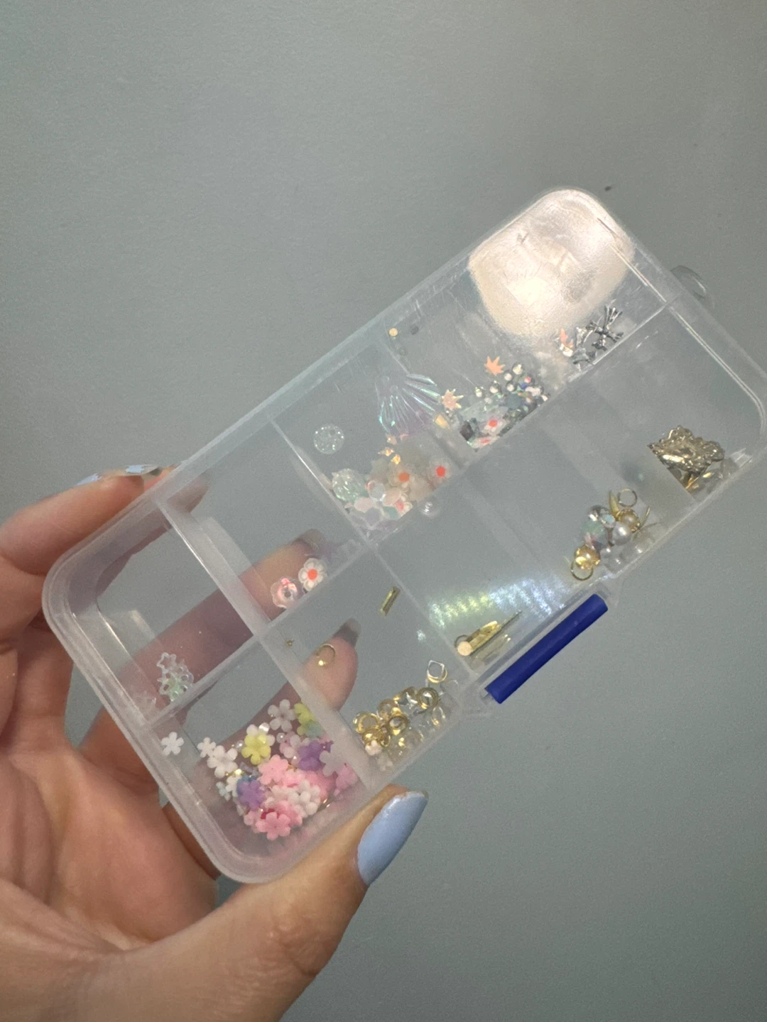 Selling a nail art decoration box with various embellishments! It includes a variety of charms, rhinestones, and other decorative pieces for creating unique nail designs