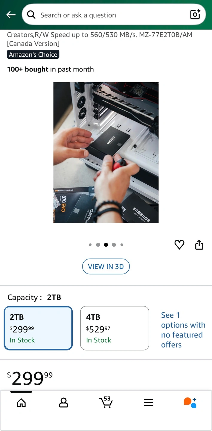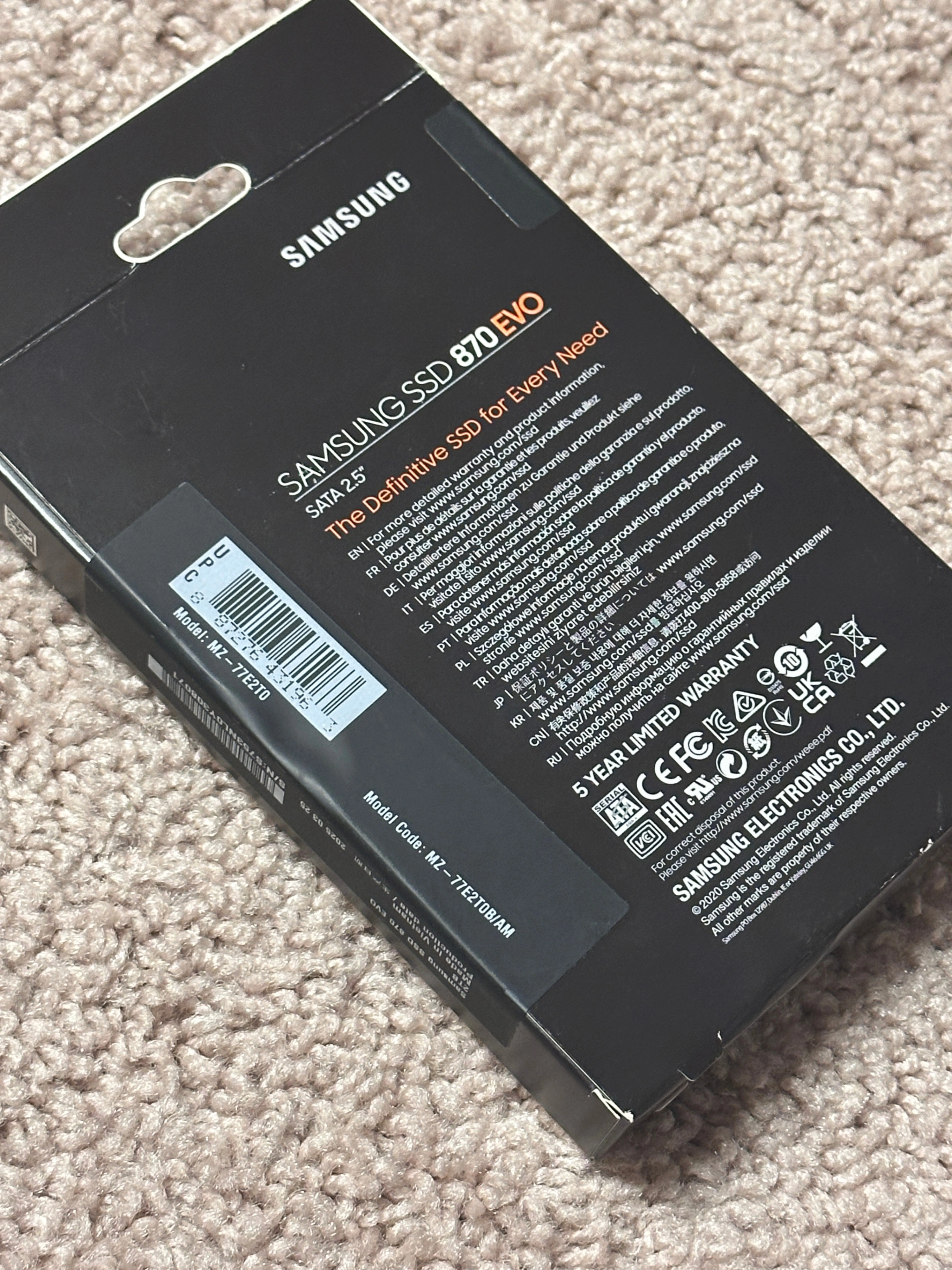 73SAMSUNG 870 EVO SATA III SSD 2TB 2.5” Internal Solid State Drive, Upgrade PC or Laptop Memory and Storage for IT Pros, Creators,R/W Speed up to 560/530 MB/s, MZ-77E2T0B/AM [Canada Version] NOTE: New SEALED THE SSD ALL-STAR: The latest 870 EVO has indisputable performance, reliability and compatibility built upon Samsung's pioneering technology. S.M.A.R.T. Support: Yes.Specific uses: Business, personal INDUSTRY-DEFINING RELIABILITY: Meet the demands of every task — from everyday computing to 8K video processing, with up to 600 TBW** under a 5-year limited warranty*** MORE COMPATIBLE THAN EVER: The 870 EVO has been compatibility tested**** for major host systems and applications, including chipsets, motherboards, NAS, and video recording devices UPGRADE WITH EASE: Using the 870 EVO SSD is as simple as plugging it into the standard 2.5 inch SATA form factor on your desktop PC or laptop; The renewed migration software takes care of the rest SAMSUNG MAGICIAN SOFTWARE: Samsung Magician 6 software**** helps you easily manage your drive, keep up the latest updates, monitor the drive's health and status, or even enhance its performance WORLD'S #1 FLASH MEMORY BRAND: Experience the performance and reliability from the world's #1 brand for flash memory since 2003;***** All firmware and components, including Samsung's world-renowned DRAM and NAND, are produced in-house, allowing end-to-end integration for quality you can trust The 870 EVO achieves the maximum SATA interface limit of 560/530 MB/s sequential speeds. Everyday users can now enjoy professional-level SSD performance. Intelligent TurboWrite accelerates write speeds and maintains long-term high performance with a larger variable buffer.