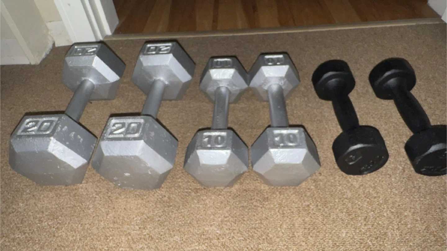 Selling a set of dumbbells in good condition. Includes , two 10lb dumbbells, and two 5lb smaller black dumbbells. Great for home workouts!
