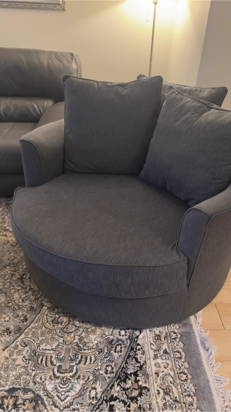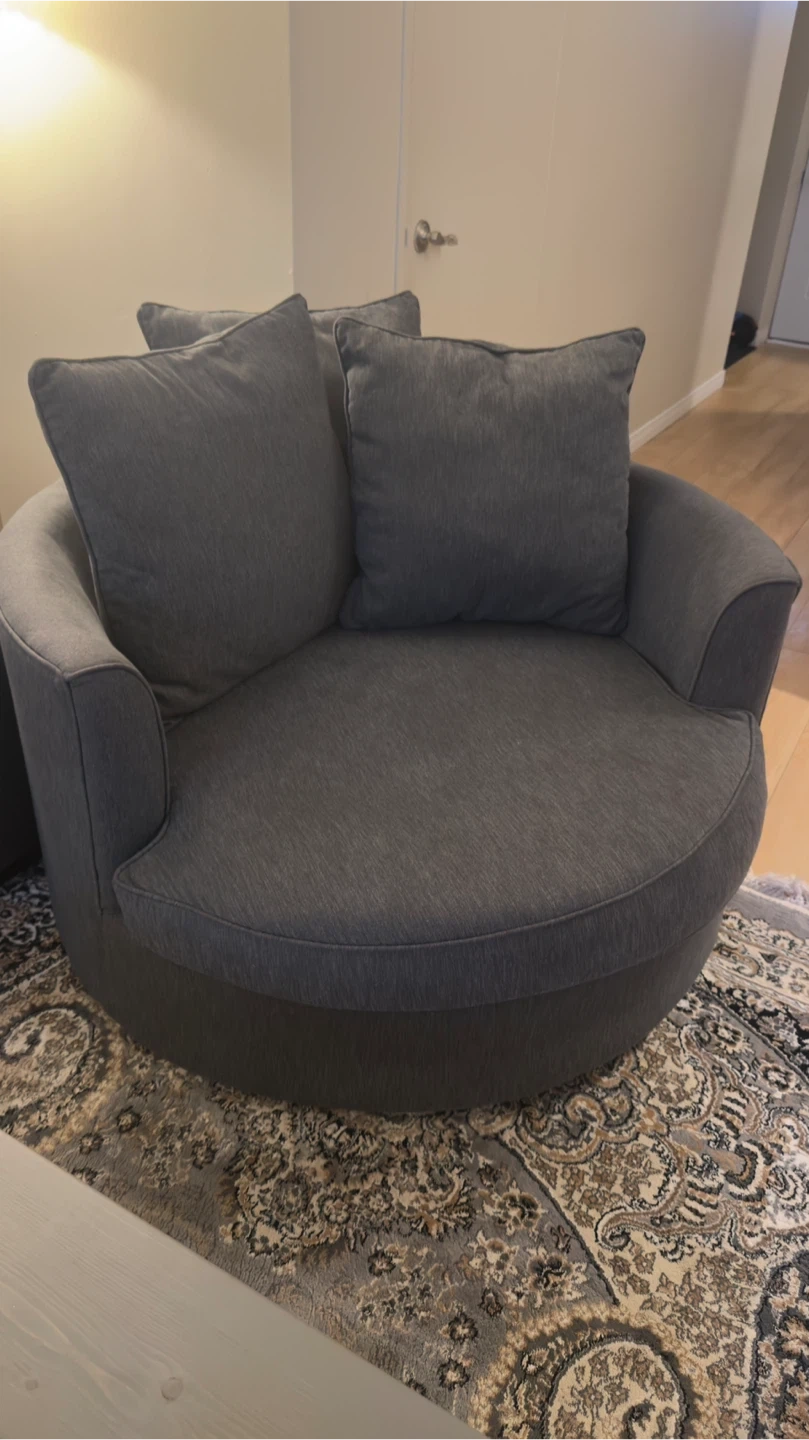 Selling a comfy grey swivel barrel chair. It's in great condition and would be a cozy addition to any room! Size is 48”. Smoke and pet free.