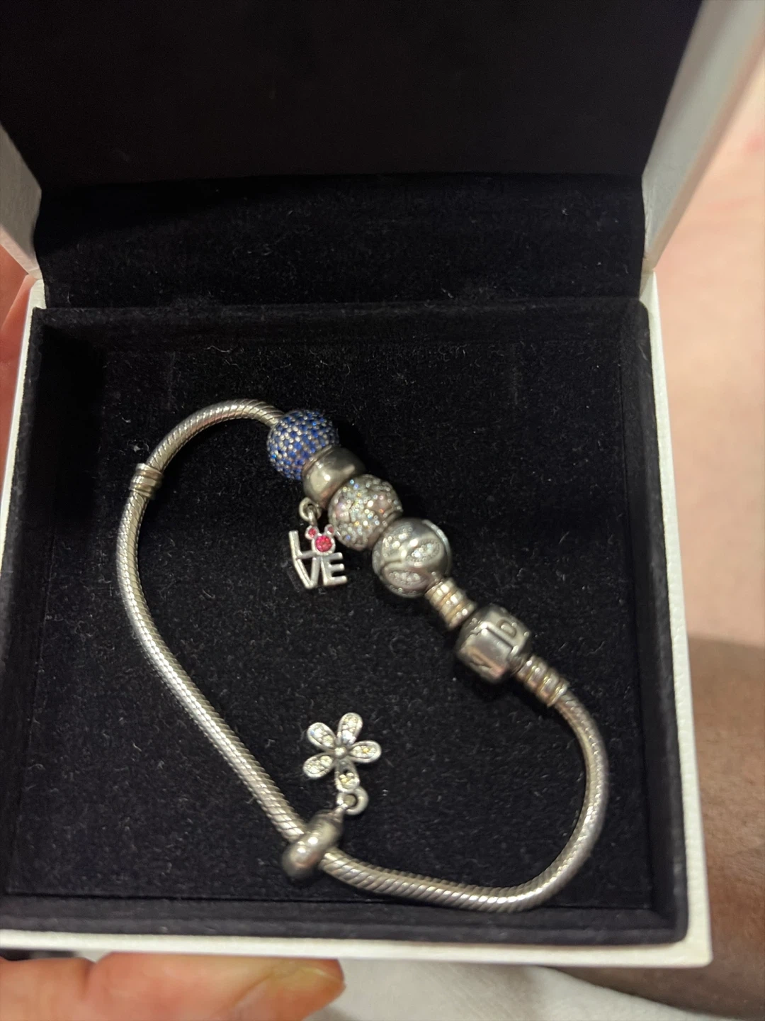 Selling a Pandora charm bracelet, complete with a variety of charms! It comes in its original box, making it perfect for gifting or safekeeping. The bracelet features a mix of silver and colourful charms, including a cute flower and a 'LOVE' charm. It's in great condition and ready for a new home! 250 obo