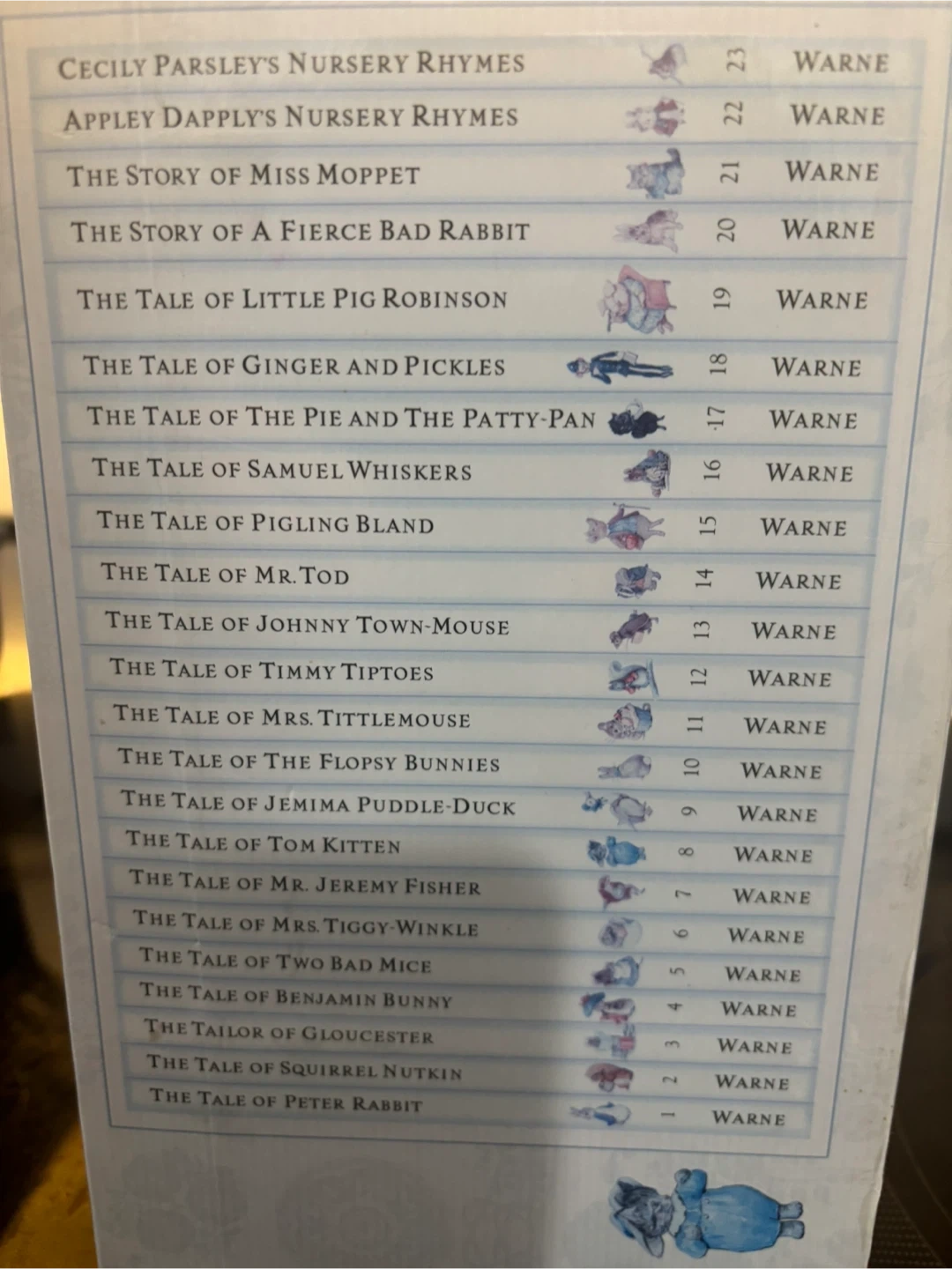 Selling a complete collection of Beatrix Potter's original tales, numbered 1 through 23! This set includes classic stories such as The Tale of Peter Rabbit, The Tale of Squirrel Nutkin, and many more. It's a wonderful addition to any children's book collection.