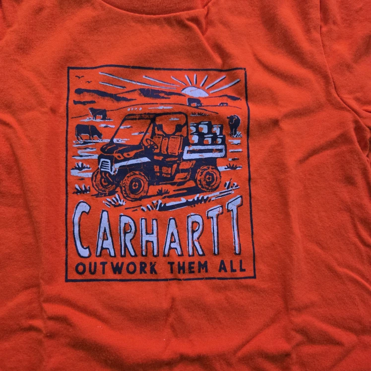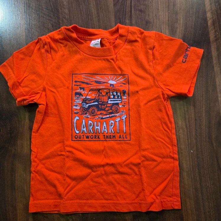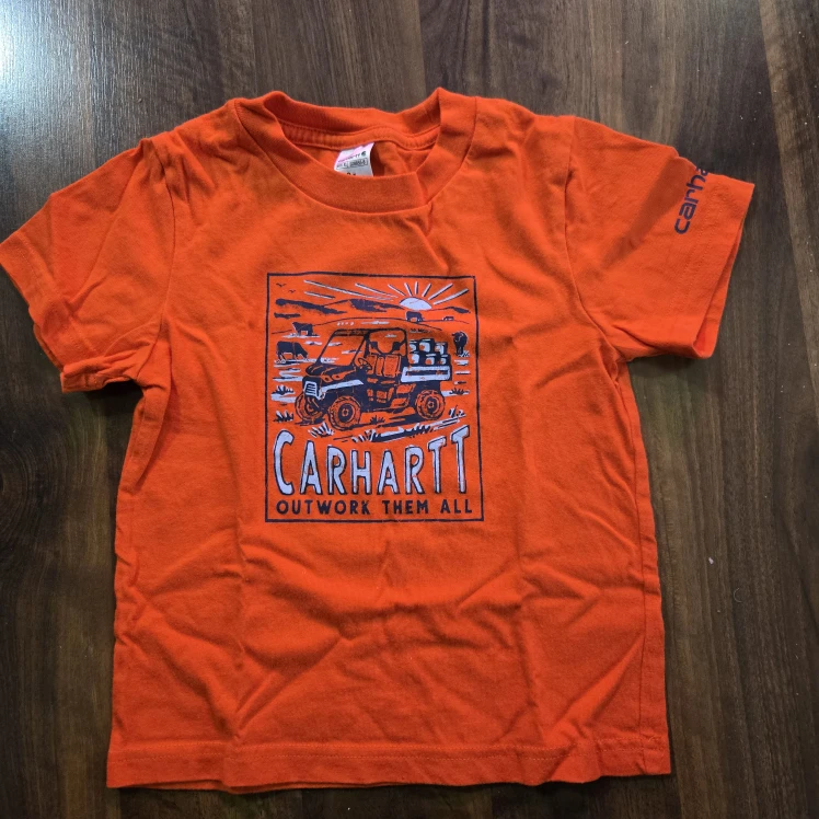 Here's a cute Carhartt kids graphic tee in size 2T! The shirt is orange and features a fun graphic on the front.